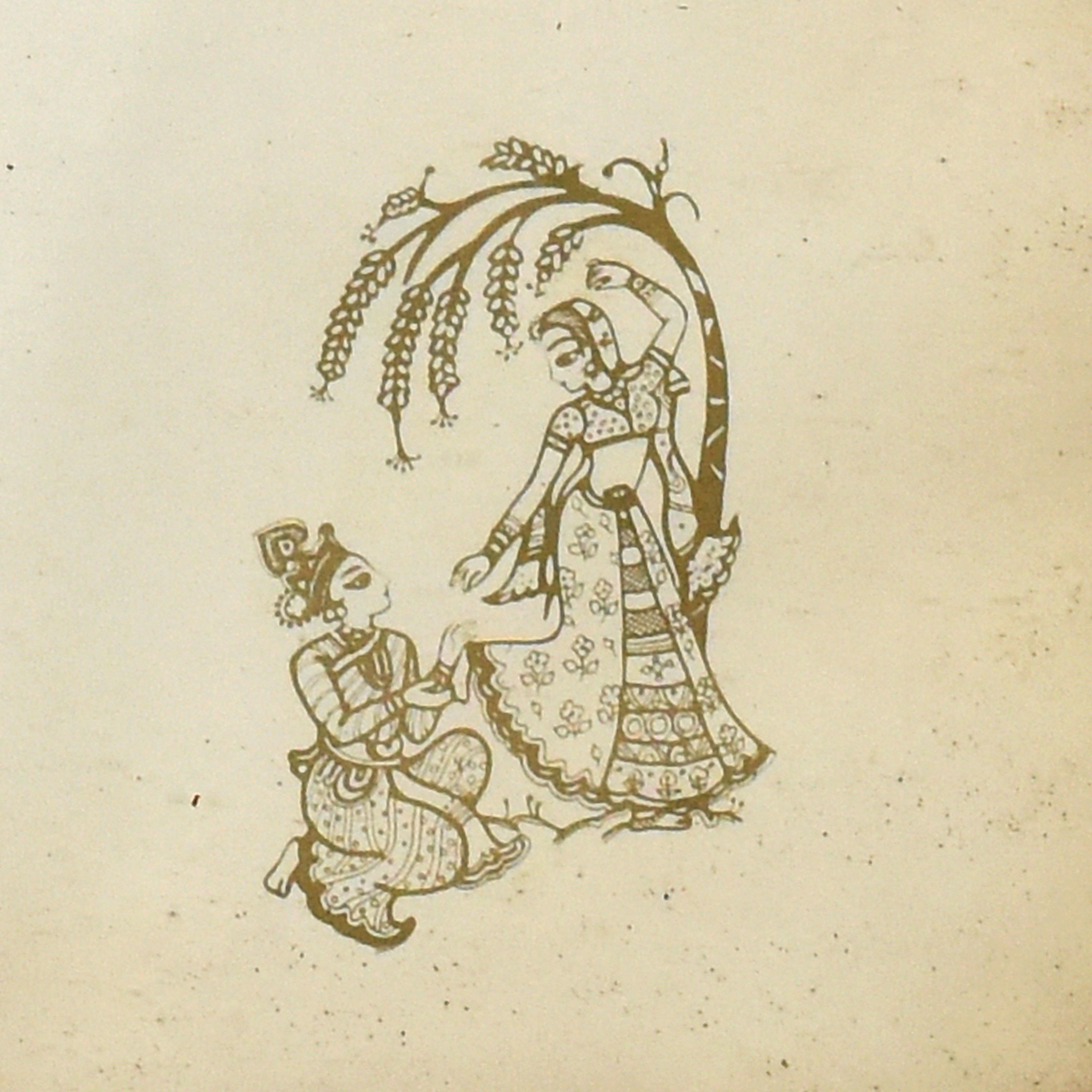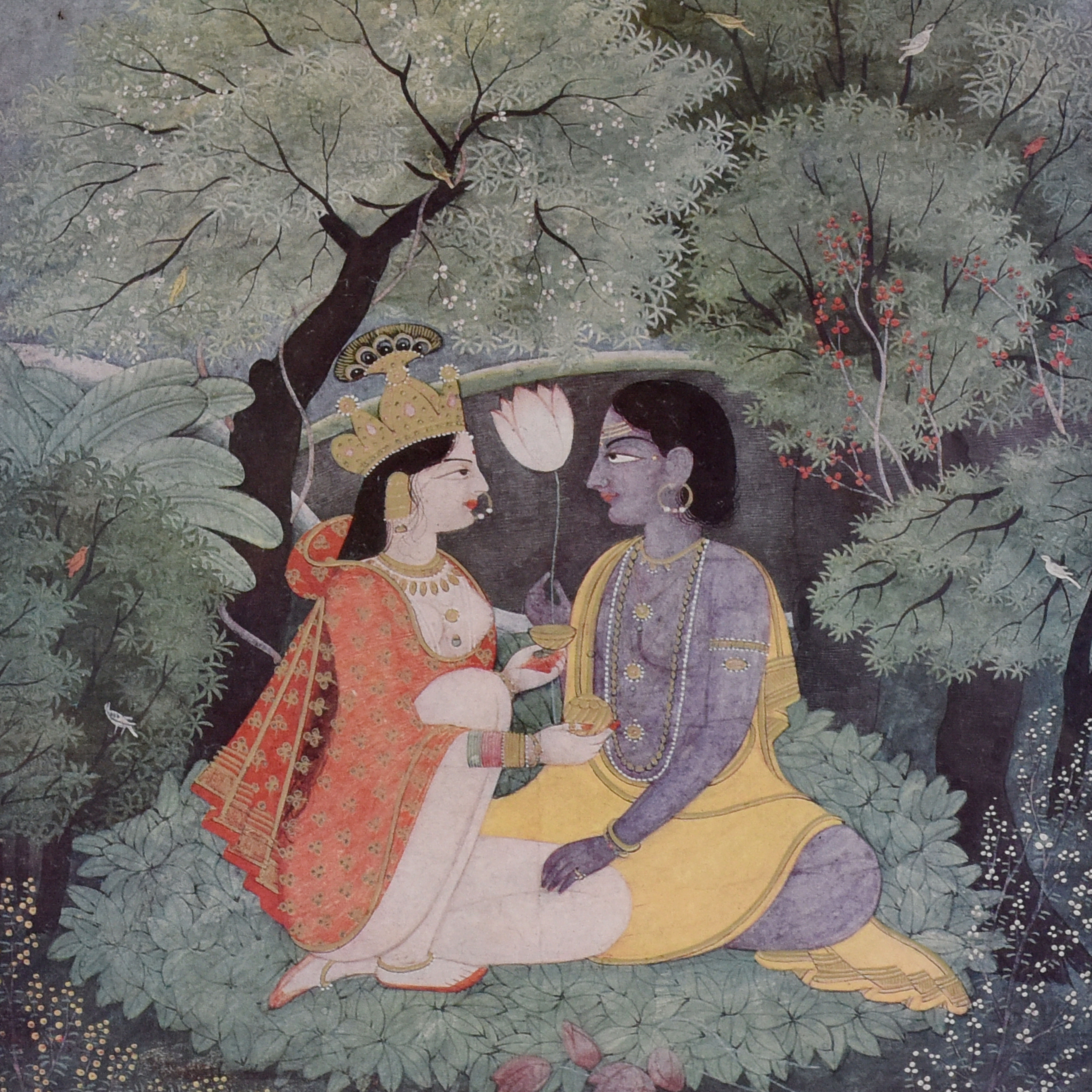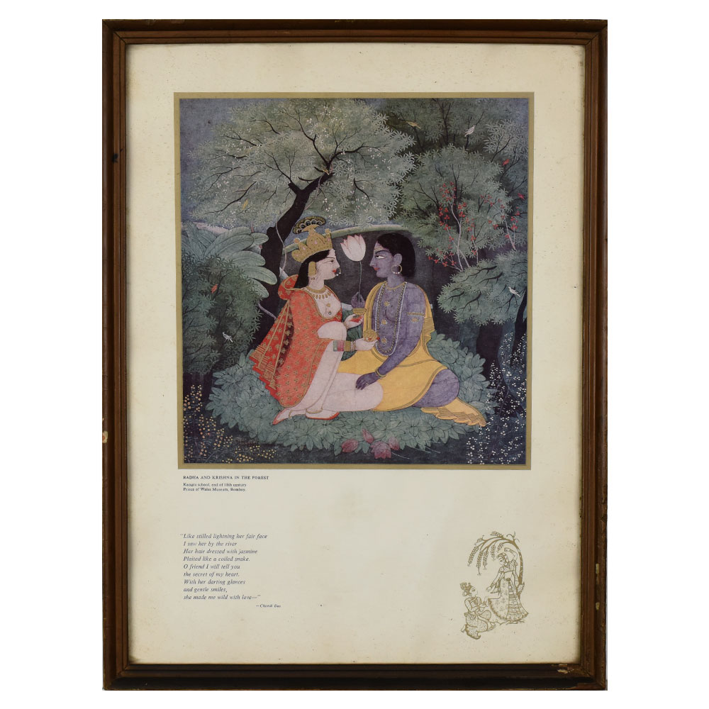 This captivating paper print depicts Radha and Krishna in the Forest, a serene and intimate moment from the Kangra school of painting, dating to the late 18th century. The scene is set amidst lush greenery, with delicately rendered trees, flowering plants, and birds, creating a romantic and tranquil backdrop. Radha, adorned in a rich red robe with intricate gold detailing, sits gracefully opposite Krishna, who is depicted with his iconic blue complexion and dressed in golden yellow attire. In her hand, Radha holds a lotus flower, symbolizing purity and divine love, while the two exchange tender gazes, embodying the eternal bond between the divine lovers.