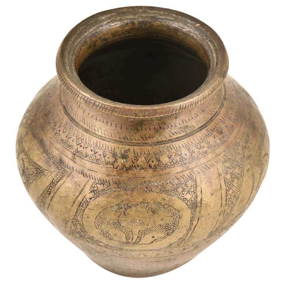 An old brass floral engraved holy water pot that is slightly broad at the centre and narrow near the neck and bottom of the pot. This decorative old brass pot would make a lovely shelf ornament, flower pot or table display.