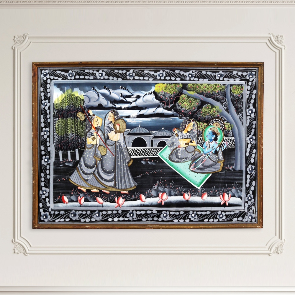 Immerse yourself in the captivating world of Hindu mythology with this breathtaking cloth painting from the artistic heart of Rajasthan. Masterfully crafted by skilled local artisans, this piece showcases the region's rich cultural heritage through its vibrant colors, intricate patterns, and captivating imagery. As the divine figures of Radha and Krishna come alive before your eyes, surrounded by their playful Gopi companions, you'll be transported to a realm of timeless beauty and spiritual connection. Whether displayed in your meditation space, living room, or bedroom, this stunning work of art will infuse your home with a sense of sacred grace and inspire deep reflection on the enduring power of love. Elevate your space and nourish your soul with this extraordinary Rajasthani cloth painting - a true masterpiece that will become a cherished centerpiece in your home for years to come, sharing the enchanting beauty of this vibrant artistic tradition with all who behold it.