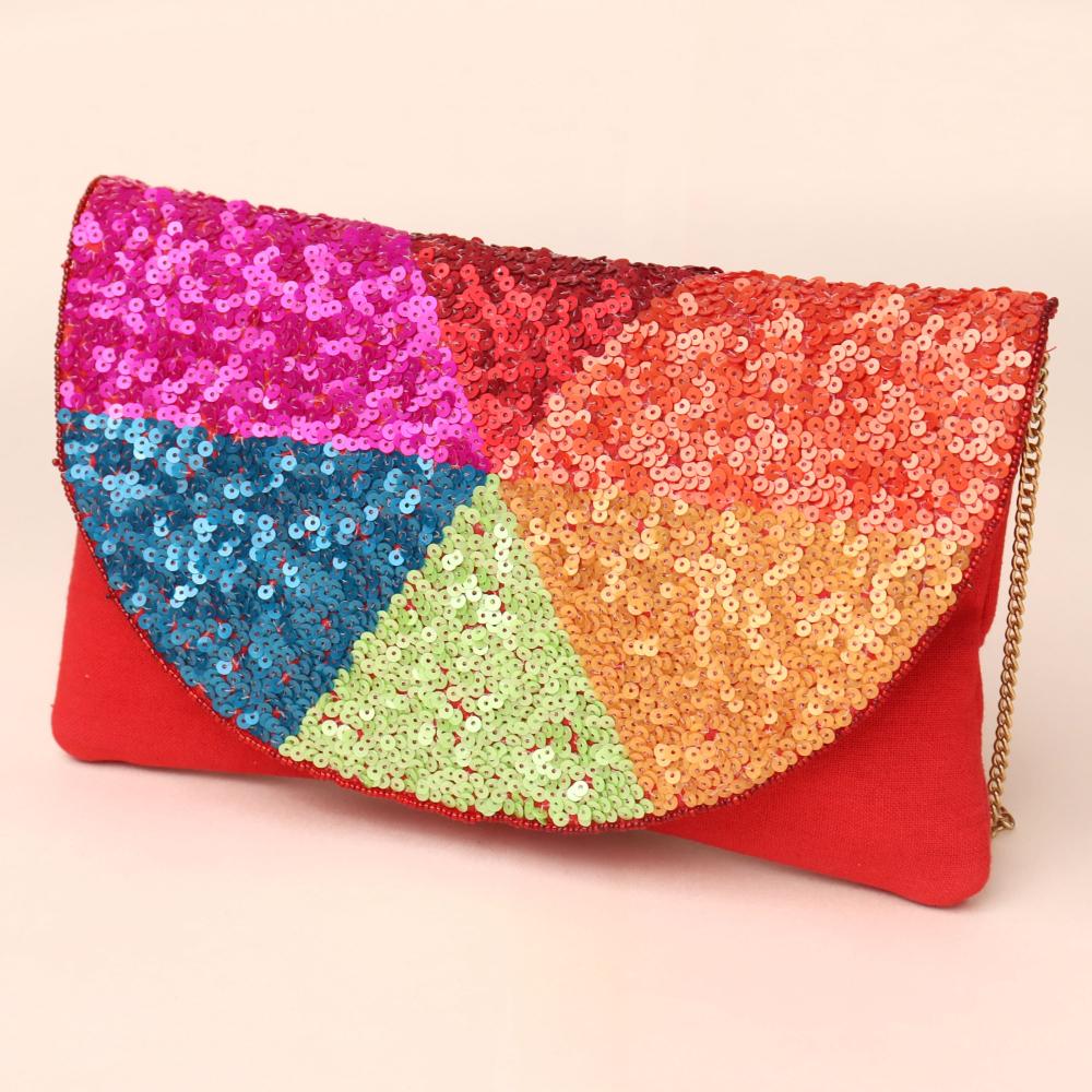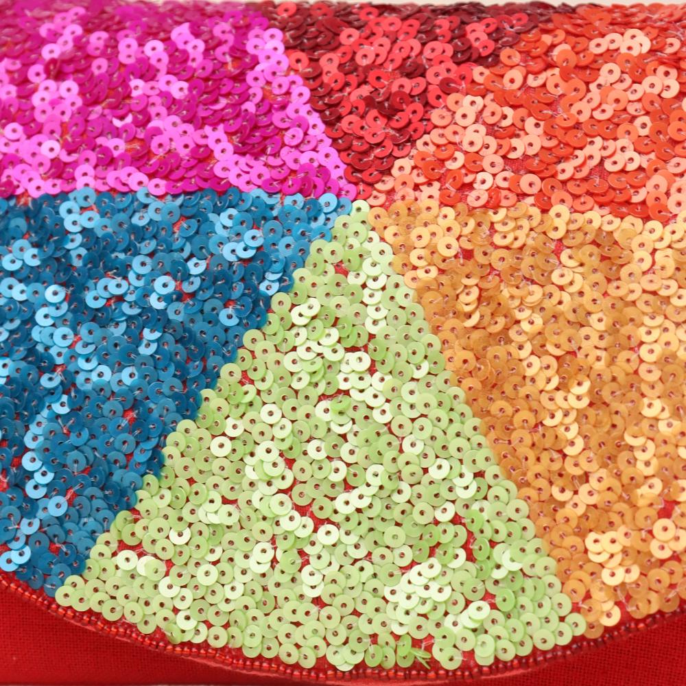 Make a dazzling statement with the Rainbow Mosaic Sling Clutch, bursting with vibrant sequin panels in a kaleidoscope of colors. Set against a bold red fabric base, this handcrafted sling bag instantly uplifts any outfit — from festive ensembles to party-ready looks. The golden chain strap adds a chic touch, letting you carry it crossbody or as a clutch.