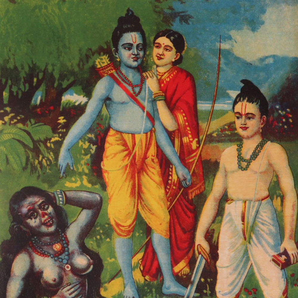 Surpanakha met Rama, Sita, and Lakshman at Panchavati while she was looking for a husband. She was enthralled by Rama's attractive figure. She approached him in the guise of a stunning woman, but Rama informed her that He was already married. Surpanakha, feeling defeated, went to Lakshman, but he sent her away, telling her that he was only Rama's servant. Her true angry demonic form emerged in the wake of this second rejection. She believed that Mata Sita's presence was the cause of her rejection. She moved quickly to eat Mata Sita. She was attacked, and Lakshmana hacked off her nose.