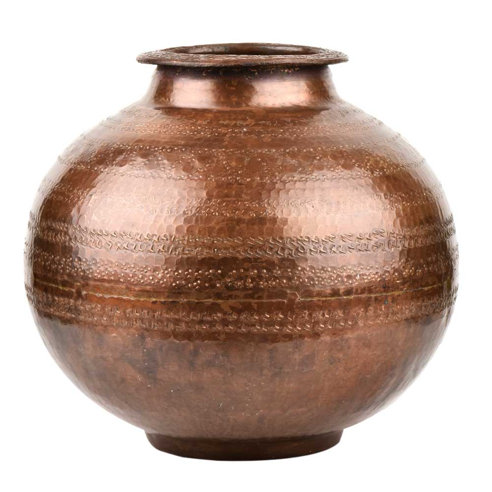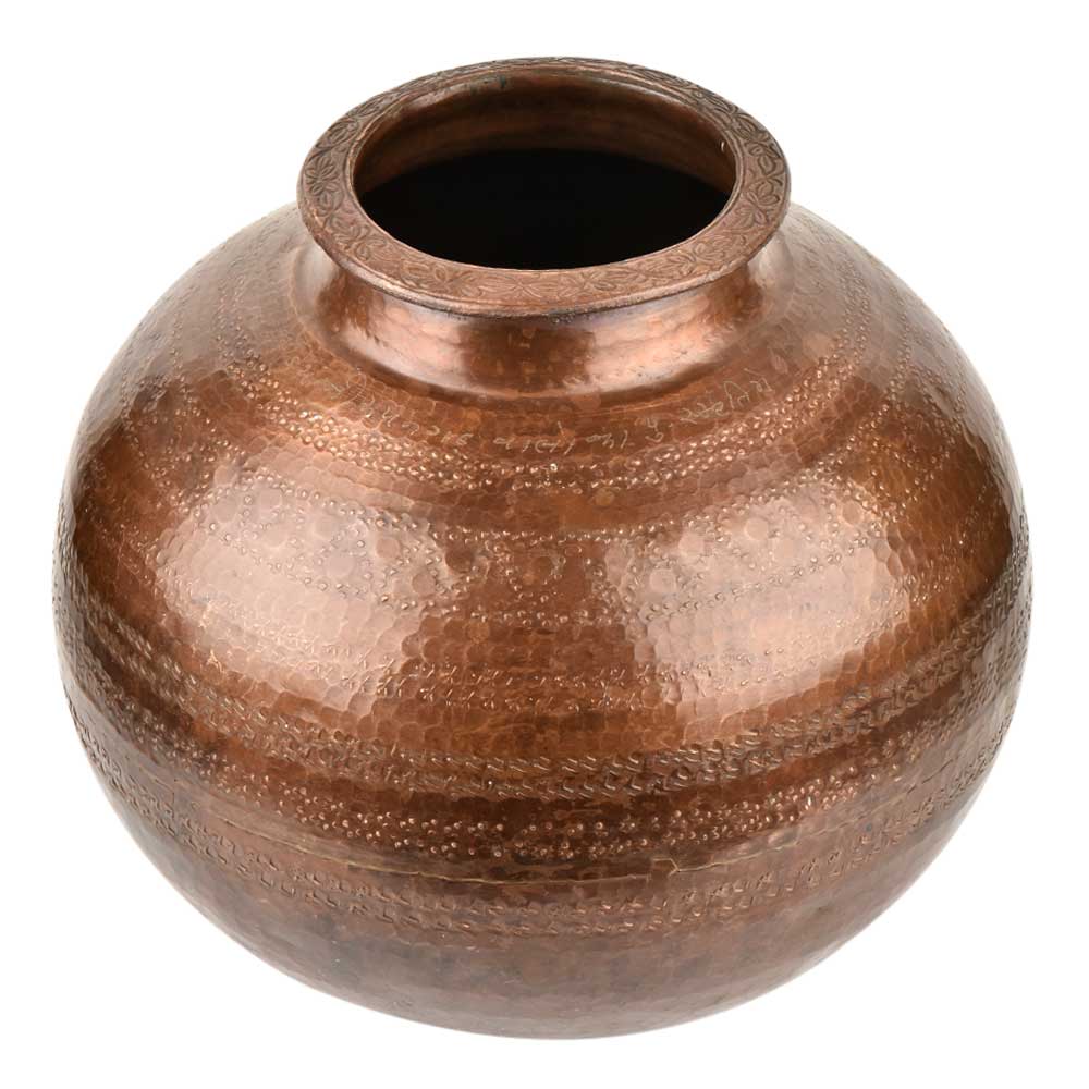 This hand crafted brass water pot is made by expert artisans of India . This brass pot has a bulbous body was filled with holy water as a nice patina was used in temples and other religious places . It has a bottom rim for support an has a large belly to store water and small mouth .It comes with a nice copper finish.