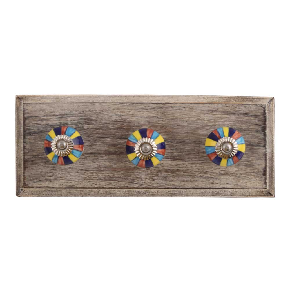 Rangoli Ceramic Wooden Hook. A Perfect Complement to the Soft Tone of the Wood are these White Traditional Hat & Coat Hook Made of Genuine Porcelain and Brass. It can be use to Hang Jewellery, Leashes, Towels, Scarves, Light Weight Sweaters, Caps Etc.