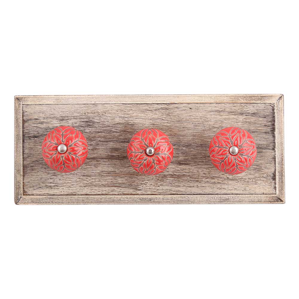 Red Amarylis Floral Etched Ceramic Wooden Hook. A Perfect Complement to the Soft Tone of the Wood are these White Traditional Hat Coat Hook Made of Genuine Porcelain and Brass. It can be use to Hang Jewellery, Leashes, Towels, Scarves, Light Weight Sweaters, Caps Etc.