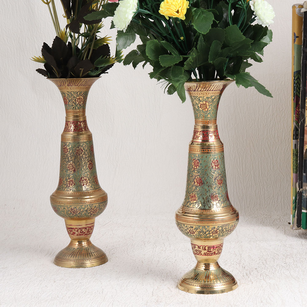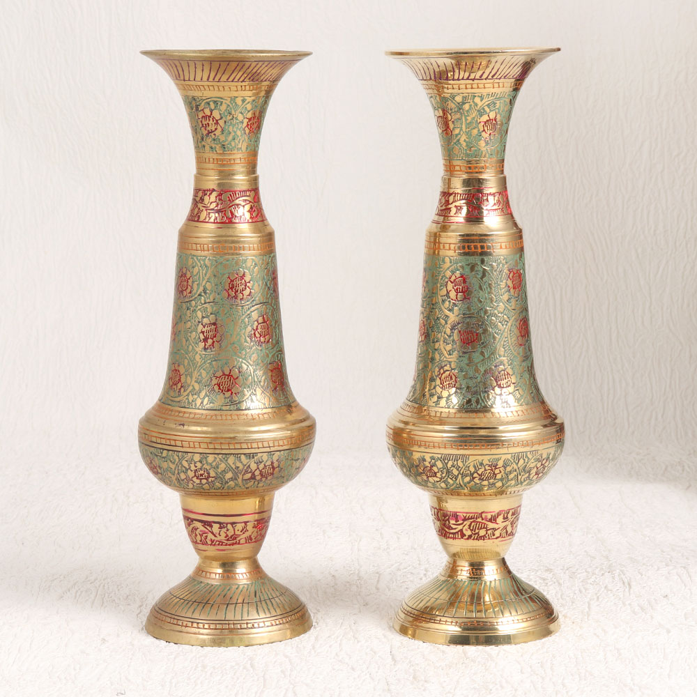 Enhance your interior decor with the timeless charm of these exquisite brass flower pots that are handmade by skilled Indian artisans. Each set includes two charming pots, adorned with intricate red and green enamel work, set against an antique golden finish. The meticulous craftsmanship ensures that each piece is a unique work of art, perfect for adding a touch of elegance to any space. Versatile and visually appealing, these flower pots can be placed in a variety of settings, including your home, restaurant, hotel, office, or cafe. Their captivating design and warm, antique golden finish make them a captivating focal point, whether you use them for fresh blooms or artificial arrangements. These enchanting brass flower pots also make for a thoughtful and symbolic gift, suitable for special, festive, or auspicious occasions. Surprise your family, friends or relatives with a piece of Indian artistry that not only brings beauty but also carries a rich cultural heritage.