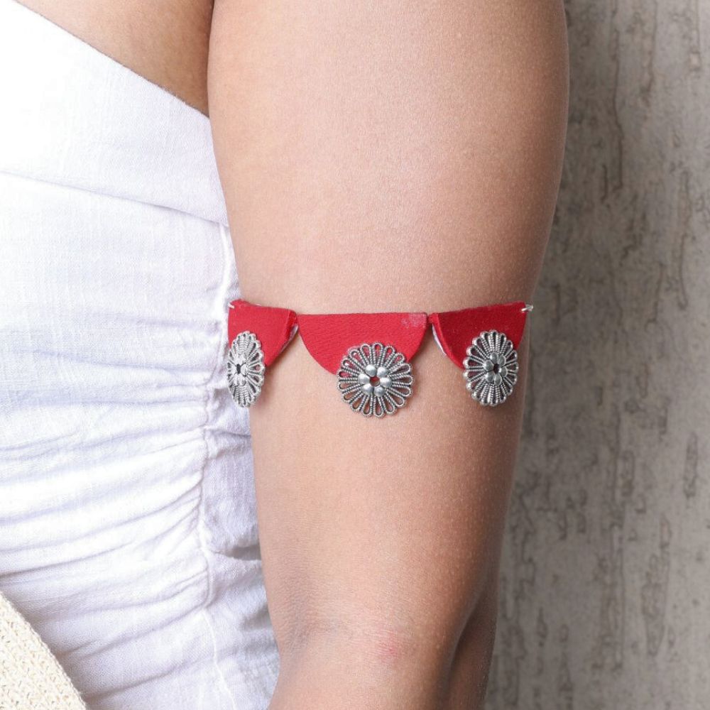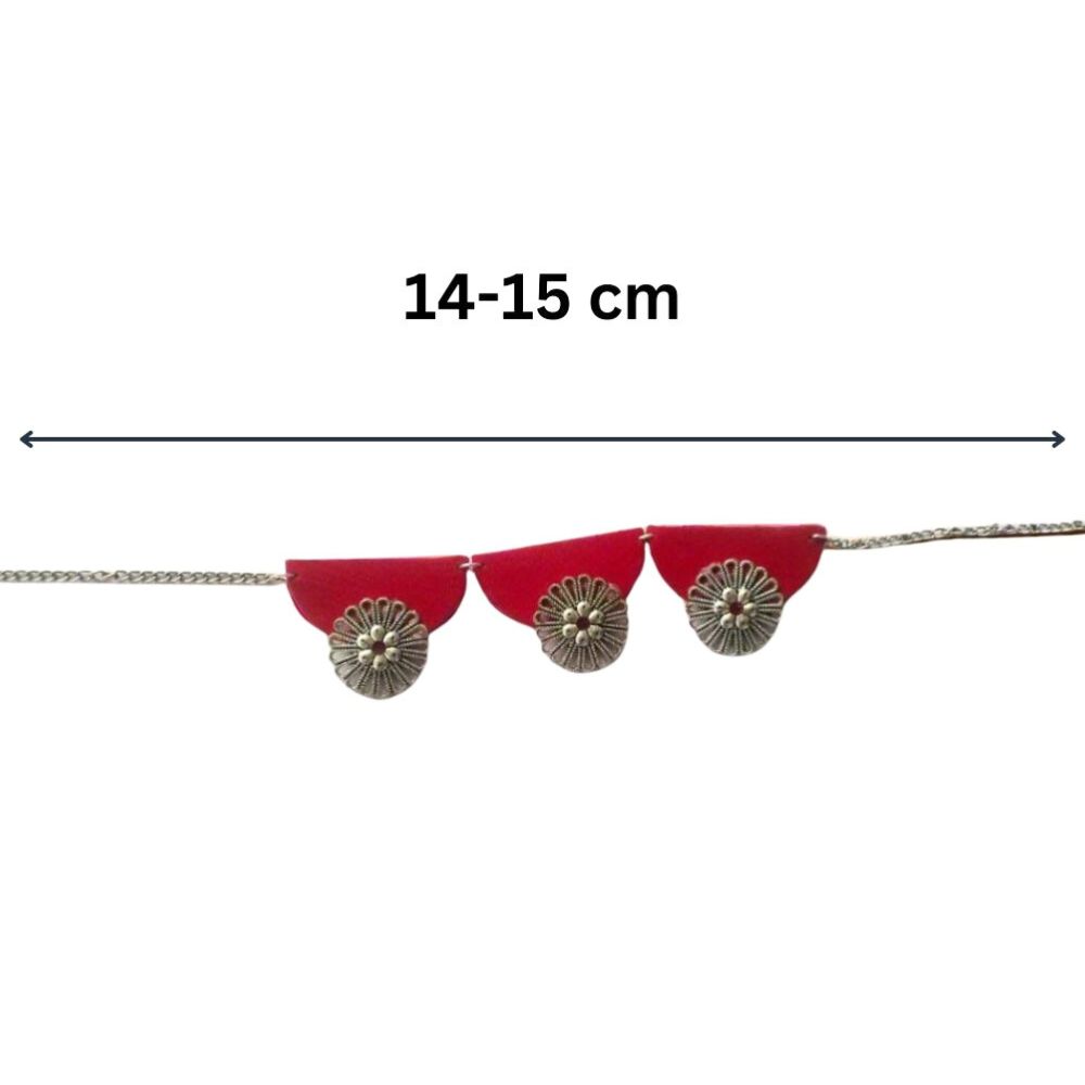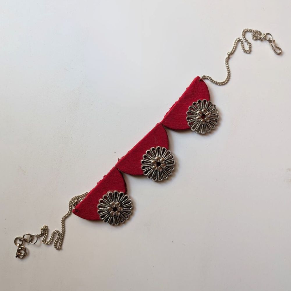 The Red and Oxidized Silver Choker for Women is a powerful blend of rich color and antique-inspired detailing. Set on a fabric base, the deep red tone creates a striking backdrop for oxidized silver elements that echo vintage Indian jewellery traditions. Designed to sit comfortably at the neckline, this choker delivers strong visual impact without feeling heavy. It is a versatile statement piece that transitions seamlessly from festive wear to cultural evenings.