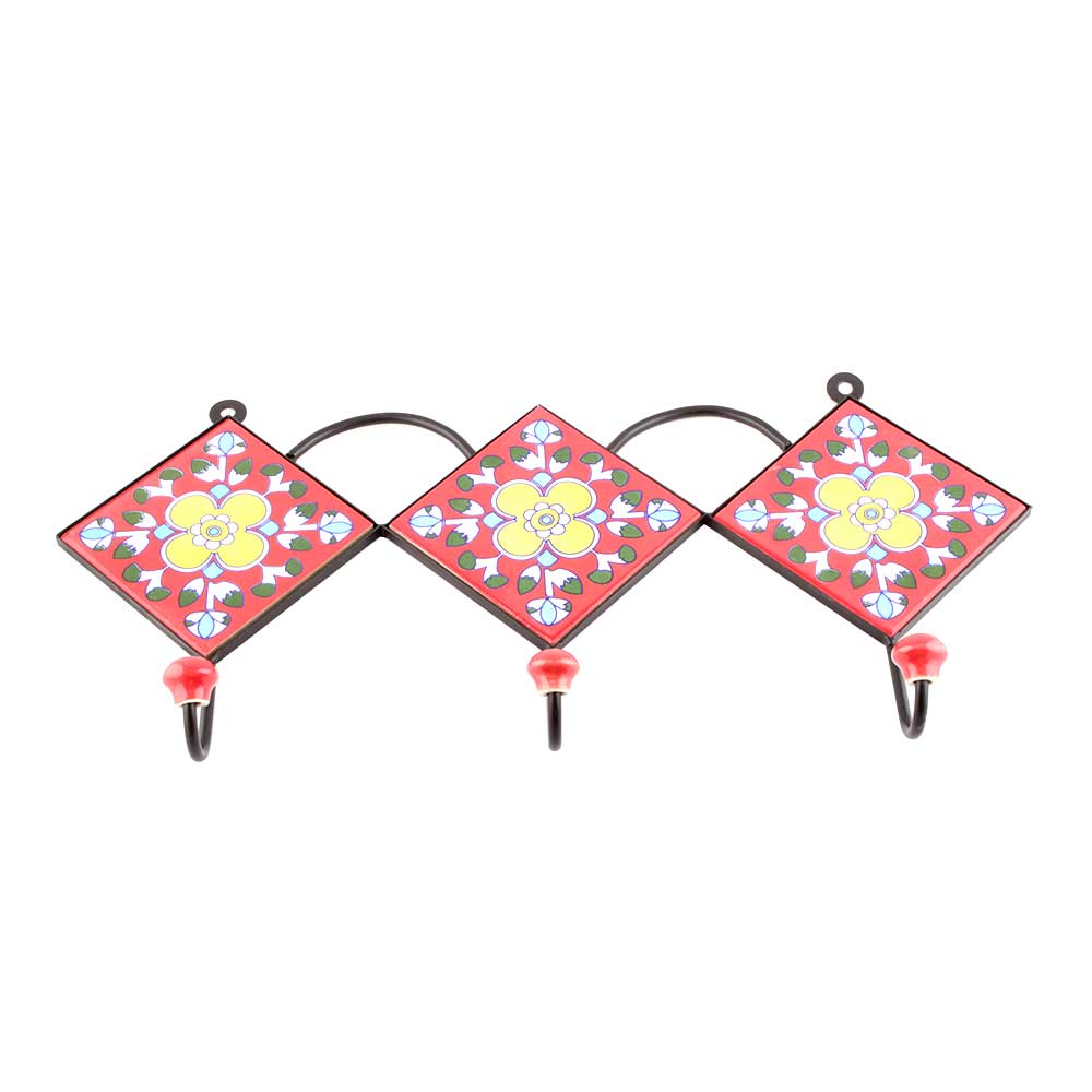 Red And Yellow Floral Ceramic Tiles Hooks. When Put on Wall or Cabinet it is an Art in itself. The Metal Part of this Hook is Black Powder Coated.