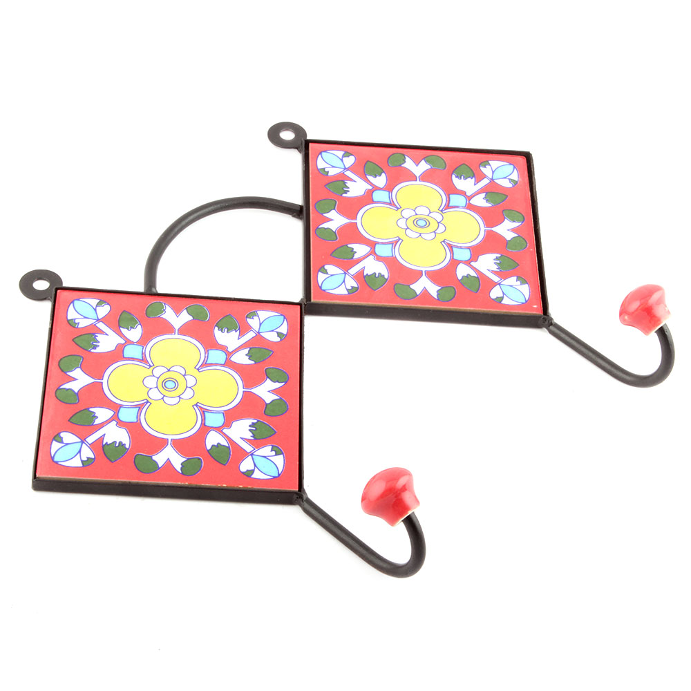 Red And Yellow Floral Tiles Hook. When Put on Wall or Cabinet it is an Art in itself. The Metal Part of this Hook is Black Powder Coated.