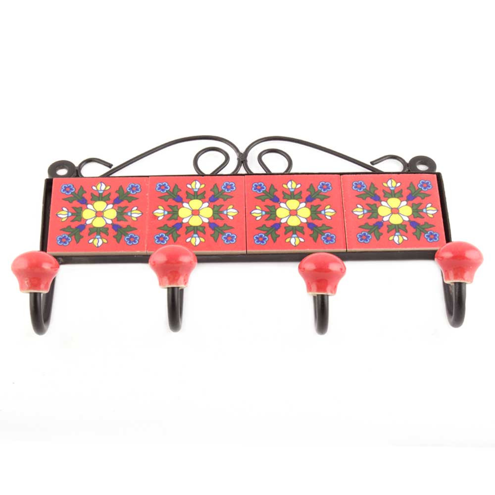 Red And Yellow Tiny Flower Ceramic Tiles Hooks. When Put on Wall or Cabinet It is An Art in Itself. The Metal Part of this Hook is Black Powder Coated.