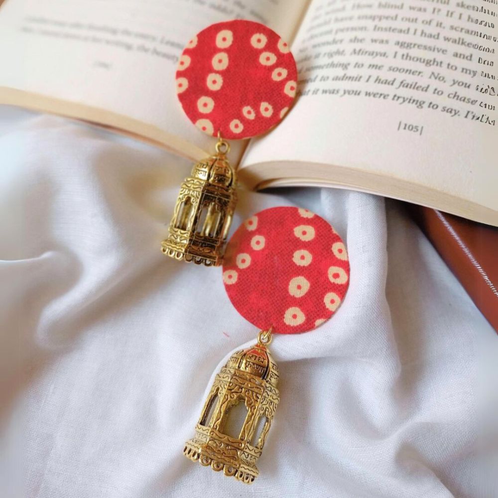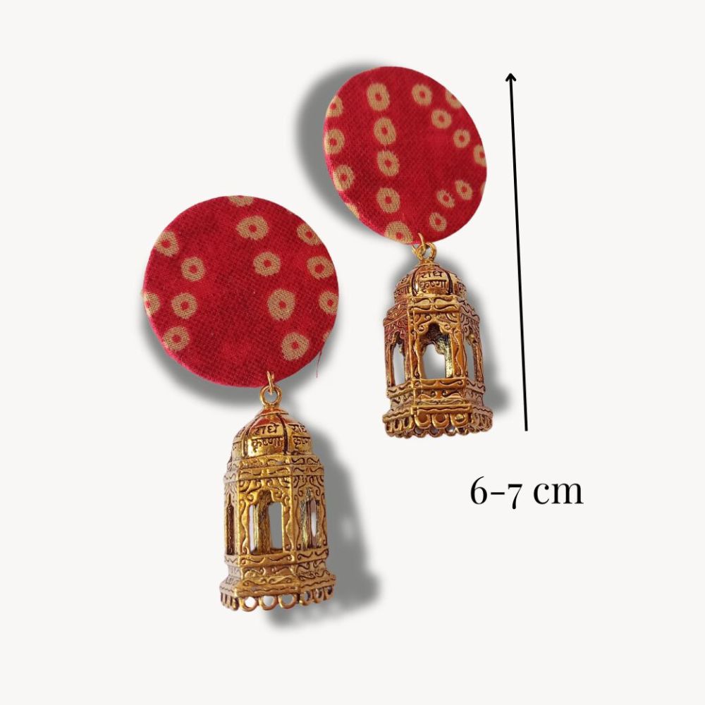 The Red Bandhani Print and Golden Long Jhumka Earrings celebrate the richness of Indian textile traditions through color, form, and movement. Crafted on a fabric base, the Bandhani-inspired print brings festive energy and cultural warmth, while the elongated jhumka silhouette adds graceful drama. Finished with golden-toned accents, these earrings glow with celebratory charm. Designed to look grand yet feel comfortable, they are ideal for occasions that call for expressive traditional style.