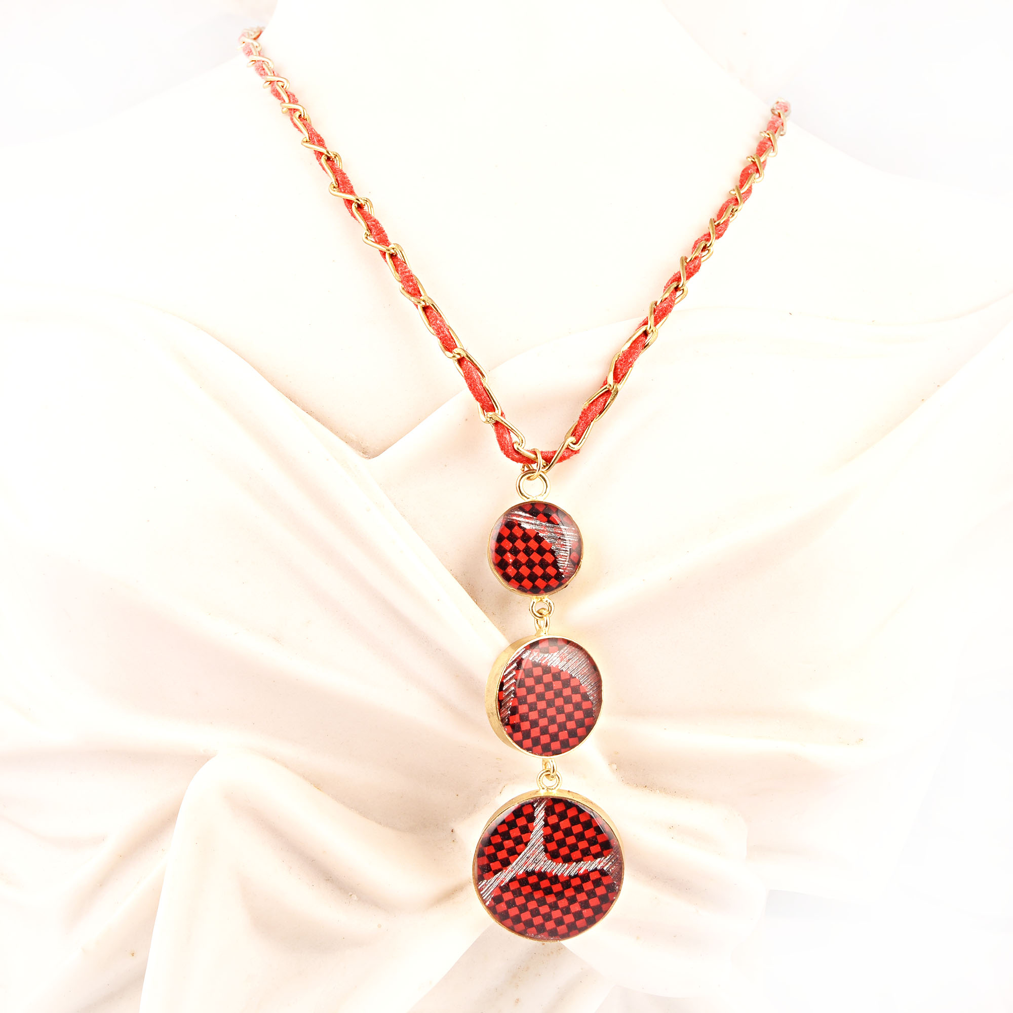 Red Checked Hangings Bead Necklace New Beautiful Jewellery. Leather, Glass, Silk with Brass Chain and Brass Clasps .
