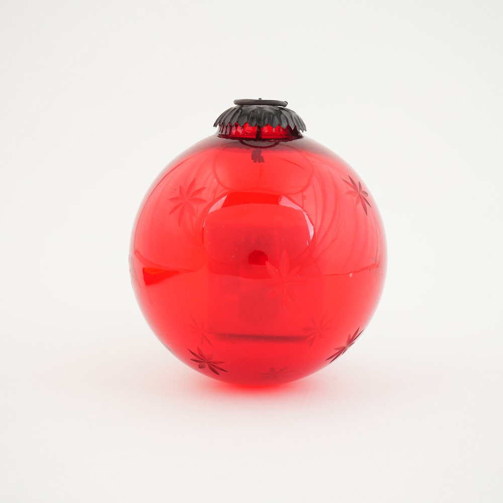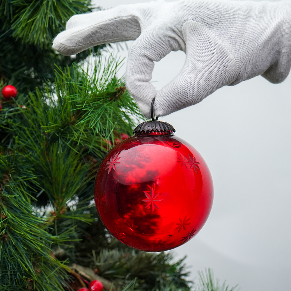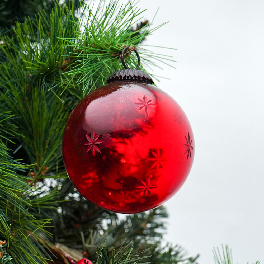 Red Decorative Glass Hanging Ornament with Star Design. Crafted from high-quality glass with a smooth glossy finish, this decorative bauble adds a classic and festive touch to Christmas trees, wreaths, and holiday displays.