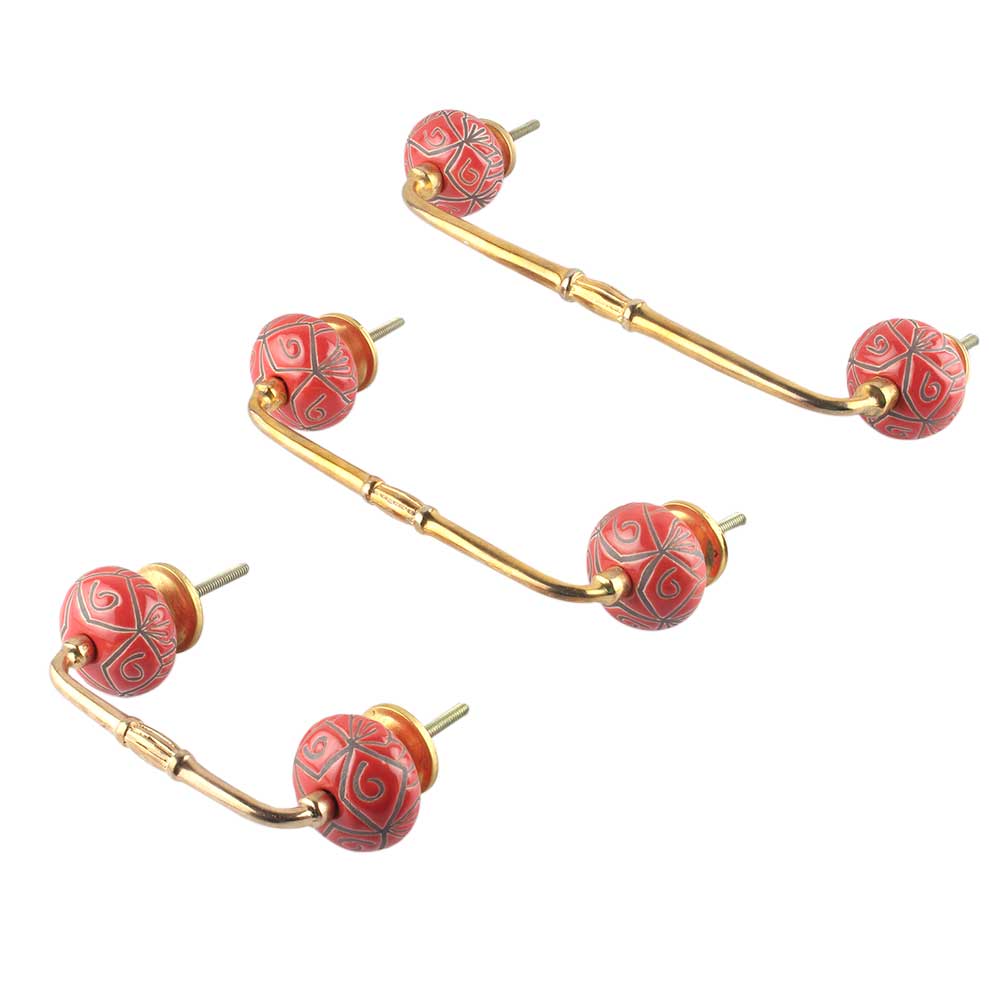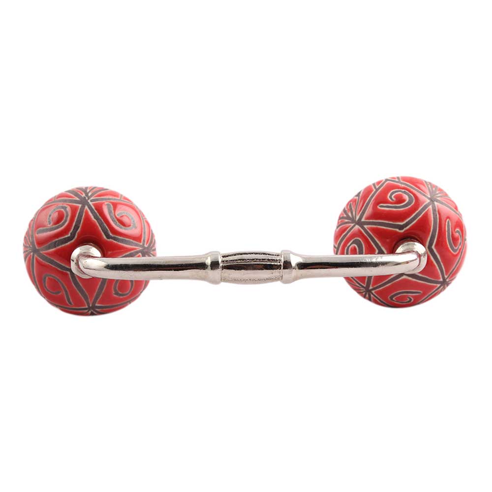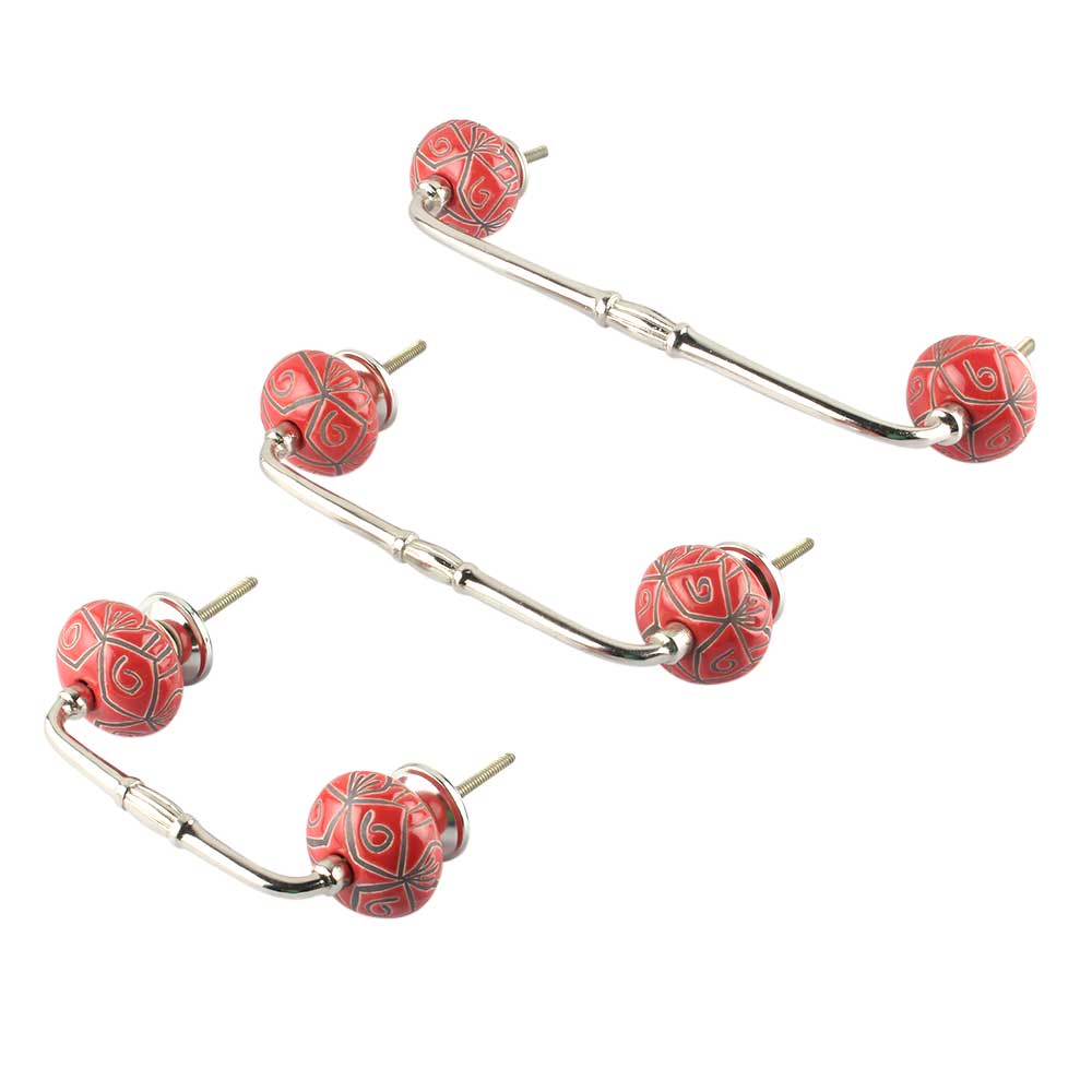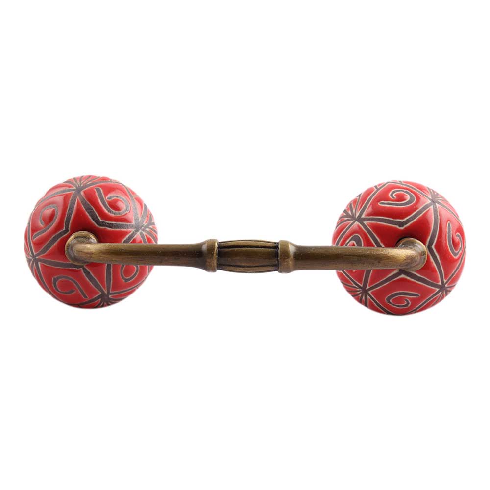 Red Etched Ceramic Floral Bridge Handle. Ideal for Drawer, Dresser, Cabinet, Wardrobe, Cupboard and Almirah.