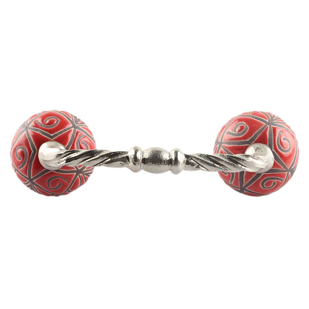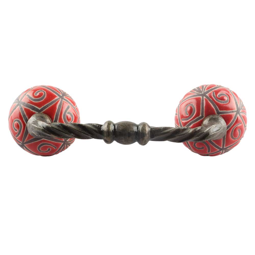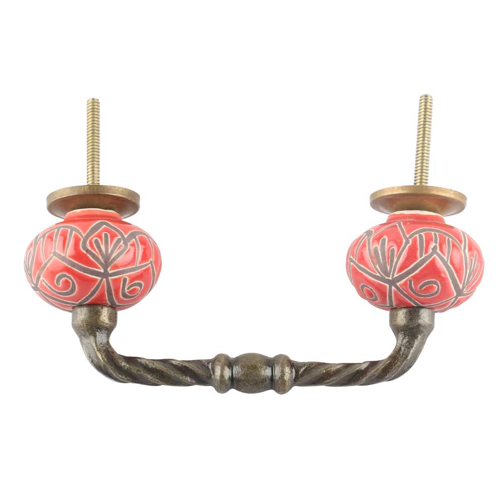 Red Etched Floral Ceramic Cut Bridge Handle Online. Ideal for Drawer, Dresser, Cabinet, Wardrobe, Cupboard and Almirah etc.