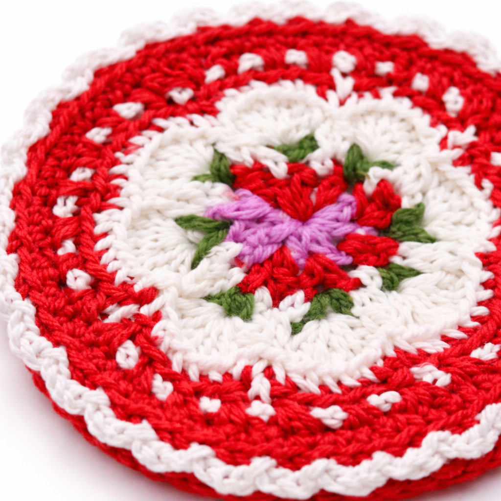 This handcrafted crochet doily coaster is made using high quality cotton yarn and features a vibrant red outer crochet pattern with a delicate floral center design. The intricate crochet stitches highlight traditional handmade craftsmanship while adding a decorative touch to coffee tables, dining tables, and tea settings. This cotton yarn doily coaster works as both a decorative accent and a functional surface protector. Product Features Handcrafted crochet doily made from cotton yarn Decorative floral center crochet pattern Vibrant red crochet design with white lace border Protects table surfaces from heat, stains, and cup marks Elegant handmade decorative table accessory Material and Craftsmanship Material: Cotton yarn Technique: Hand crocheted Shape: Round Design: Floral crochet doily pattern Finish: Soft handcrafted cotton texture Usage Ideas Tea cup and coffee mug coaster Decorative doily for trays and table displays Accent mat for dining tables and coffee tables Handmade dcor accessory for kitchen and living spaces Care Instructions Hand wash gently with mild detergent and allow it to air dry flat to maintain the crochet structure and cotton yarn quality. FAQs What material is used to make this crochet coaster? This coaster is handcrafted using durable cotton yarn. Can it be used for hot drinks? Yes, it can be used as a coaster for tea cups, coffee mugs, and glasses. Will every handmade piece look identical? No. Since each piece is handmade, slight variations may occur, making each item unique.