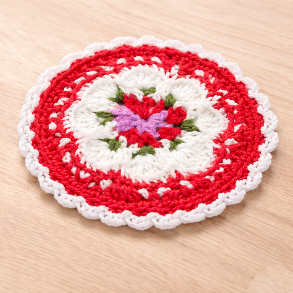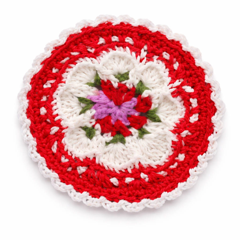 This handcrafted crochet doily coaster is made using high quality cotton yarn and features a vibrant red outer crochet pattern with a delicate floral center design. The intricate crochet stitches highlight traditional handmade craftsmanship while adding a decorative touch to coffee tables, dining tables, and tea settings. This cotton yarn doily coaster works as both a decorative accent and a functional surface protector. Product Features Handcrafted crochet doily made from cotton yarn Decorative floral center crochet pattern Vibrant red crochet design with white lace border Protects table surfaces from heat, stains, and cup marks Elegant handmade decorative table accessory Material and Craftsmanship Material: Cotton yarn Technique: Hand crocheted Shape: Round Design: Floral crochet doily pattern Finish: Soft handcrafted cotton texture Usage Ideas Tea cup and coffee mug coaster Decorative doily for trays and table displays Accent mat for dining tables and coffee tables Handmade dcor accessory for kitchen and living spaces Care Instructions Hand wash gently with mild detergent and allow it to air dry flat to maintain the crochet structure and cotton yarn quality. FAQs What material is used to make this crochet coaster? This coaster is handcrafted using durable cotton yarn. Can it be used for hot drinks? Yes, it can be used as a coaster for tea cups, coffee mugs, and glasses. Will every handmade piece look identical? No. Since each piece is handmade, slight variations may occur, making each item unique.