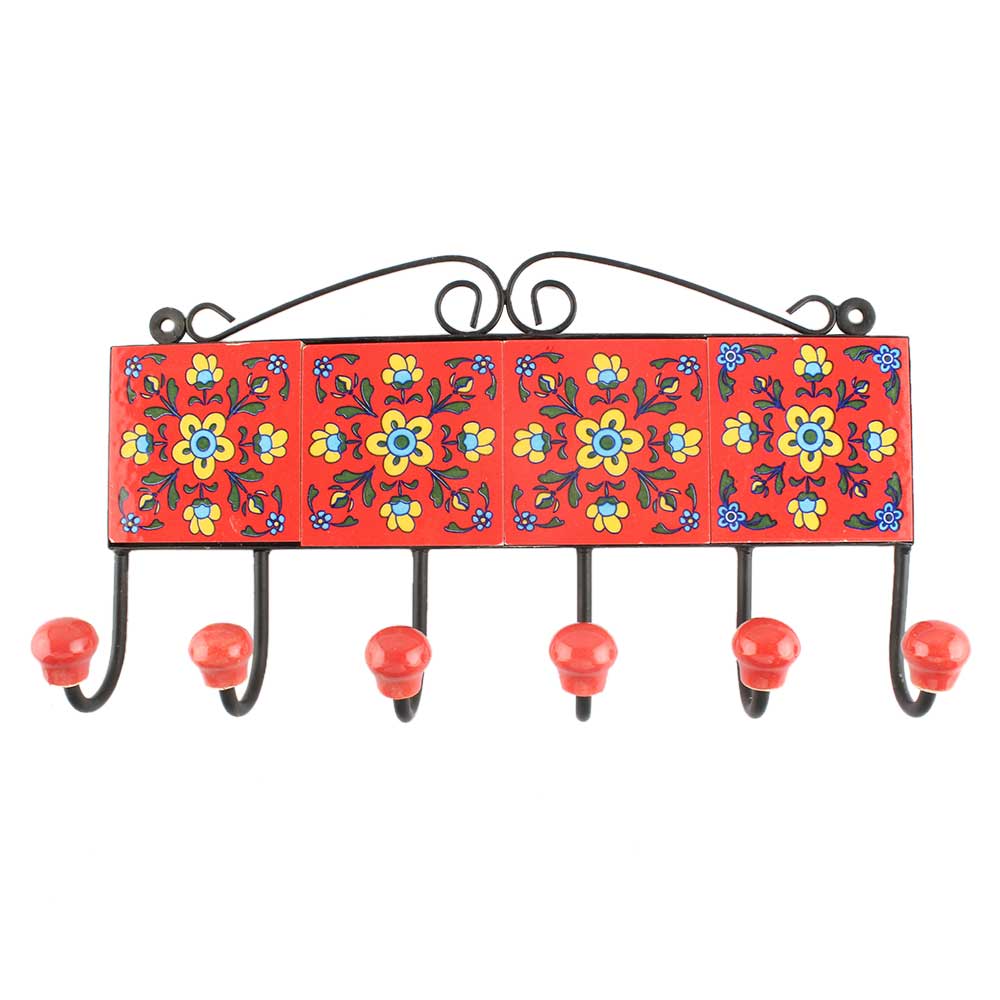 Red Flower Ceramic Tile Hook. When Put on Wall or Cabinet It is An Art in Itself. The Metal Part of this Hook is Black Powder Coated.