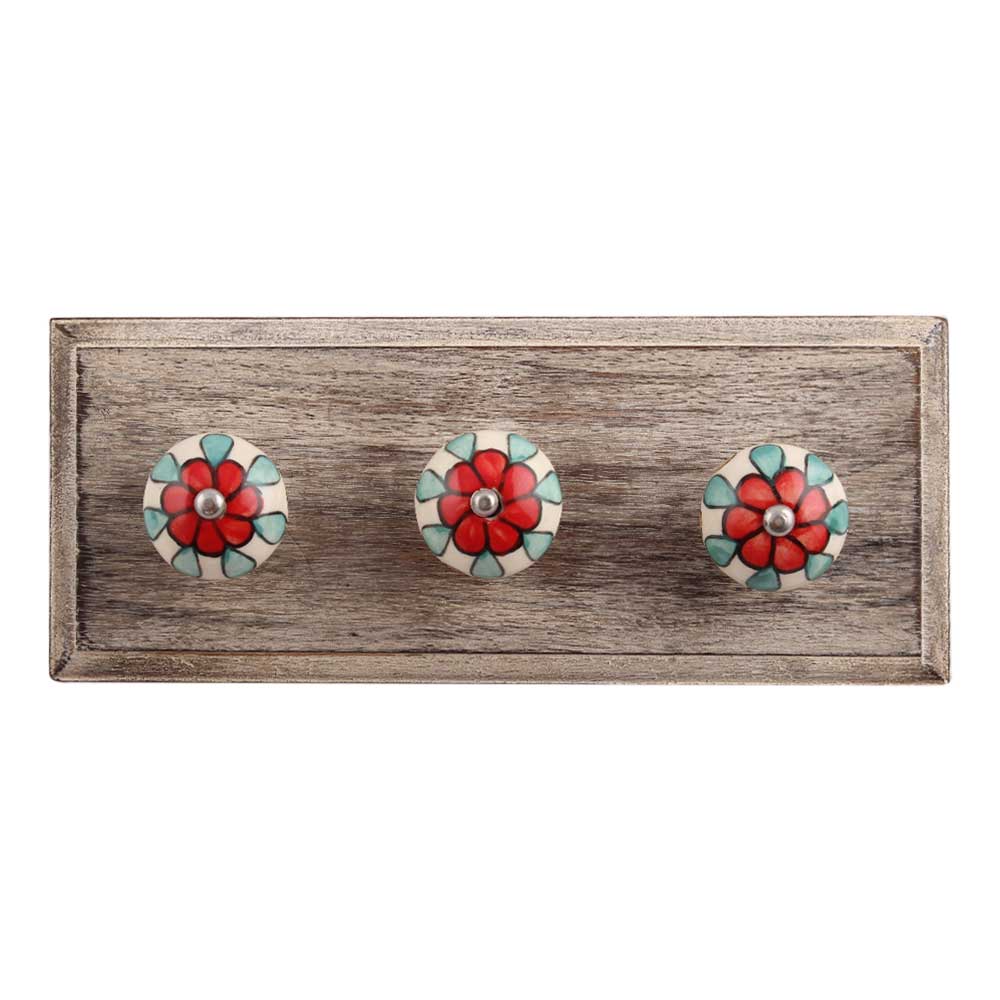 Red Flower Ceramic Wooden Hook. A Perfect Complement to the Soft Tone of the Wood are these White Traditional Hat Coat Hook Made of Genuine Porcelain and Brass. It can be use to Hang Jewellery, Leashes, Towels, Scarves, Light Weight Sweaters, Caps Etc.