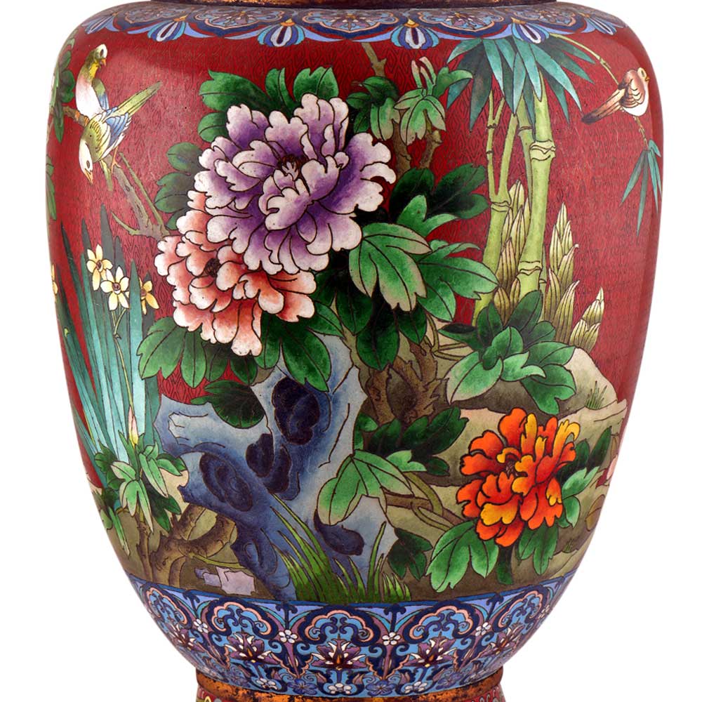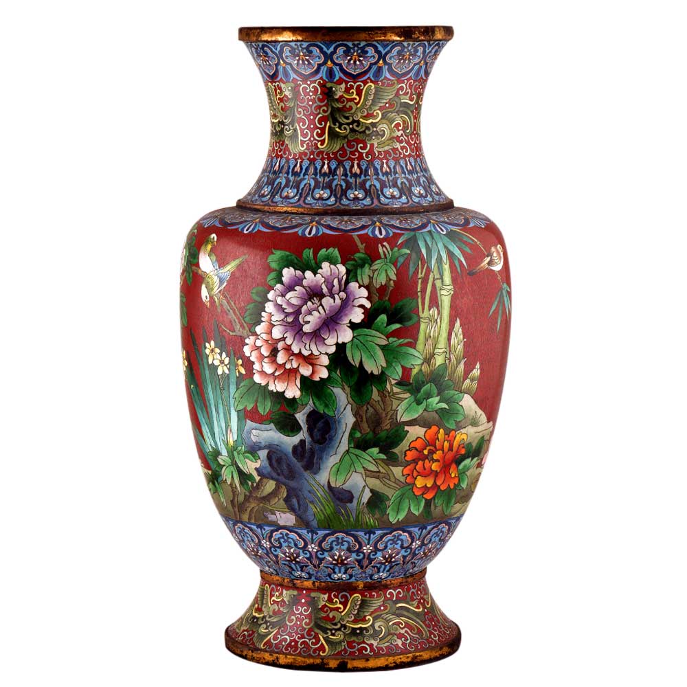 Beautiful cloisonné vase manufactured in bronze and hand painted, has been hand painted in vibrant red, creating an elegant backdrop for the bird and peony flower motif, created by using the Cloisonné technique. Vibrant bird and flower motif make it an elegant showpiece wherever it is placed.