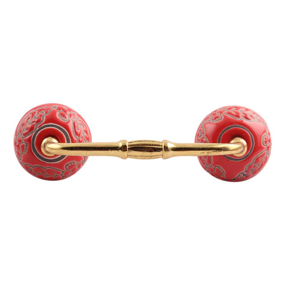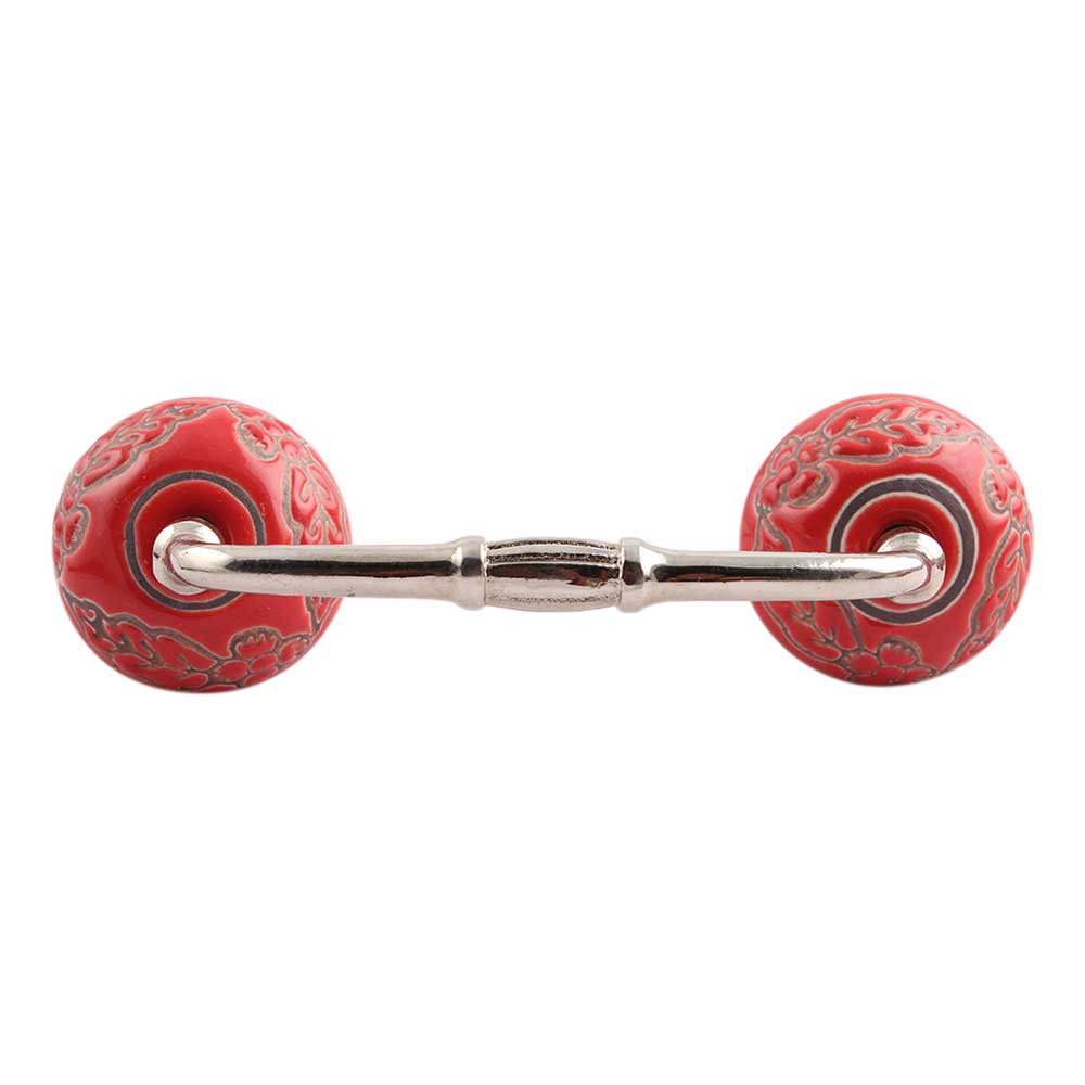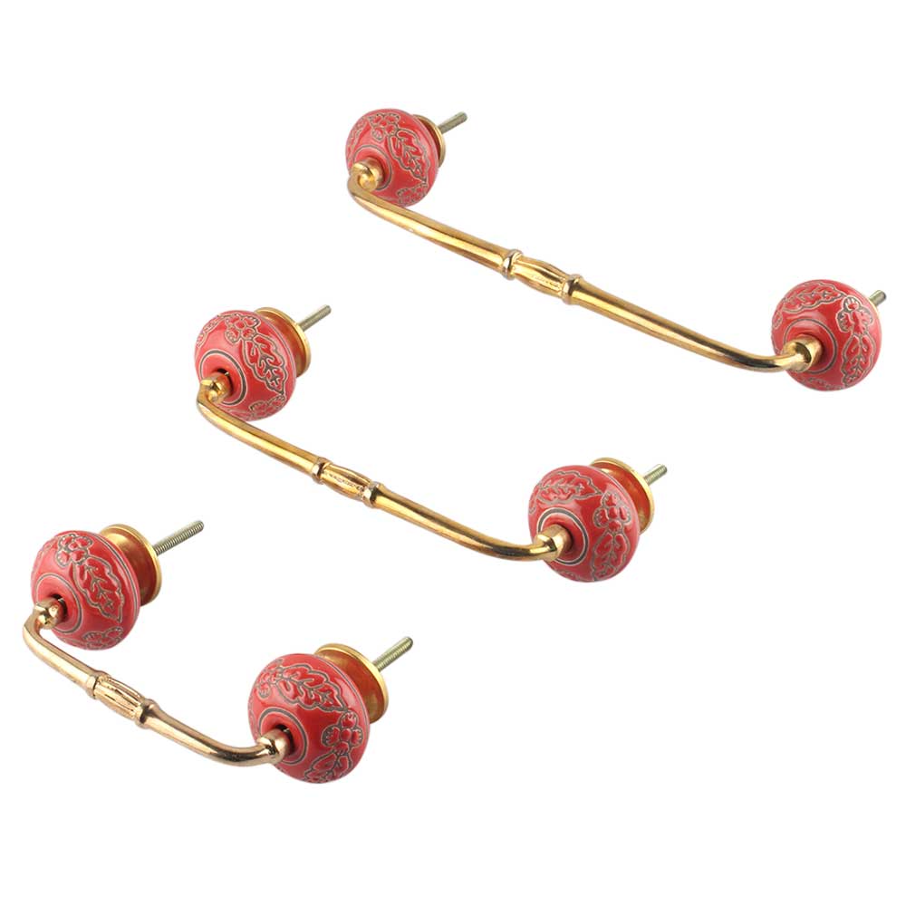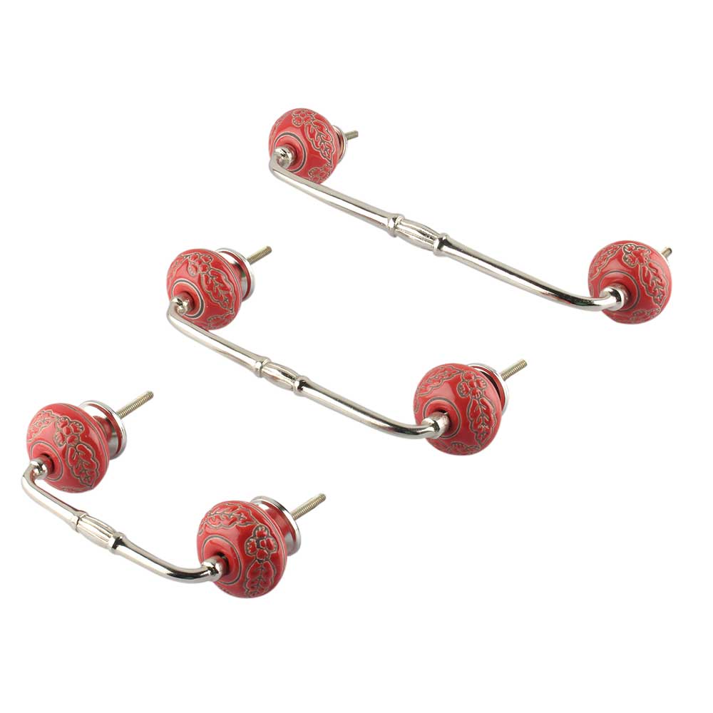 Red Leaf Flower Etched Ceramic Bridge Handle. Ideal for Drawer, Dresser, Cabinet, Wardrobe, Cupboard and Almirah.