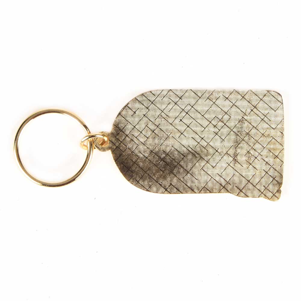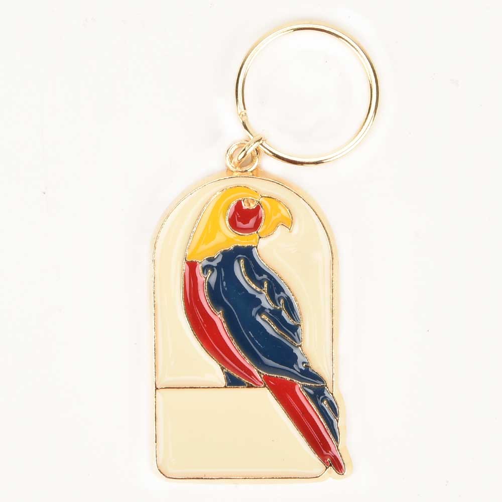 Red Macaw In A Cage On Brass Keychain.