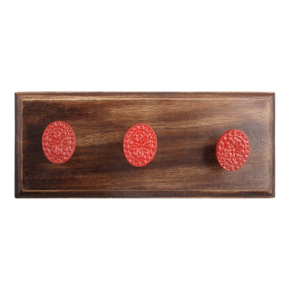 Red Oval Flower Metal Wooden Hook. A Perfect Complement to the Soft Tone of the Wood are these White Traditional Hat & Coat Hook Made of Genuine Porcelain and Brass. It can be use to Hang Jewellery, Leashes, Towels, Scarves, Light Weight Sweaters, Caps Etc.