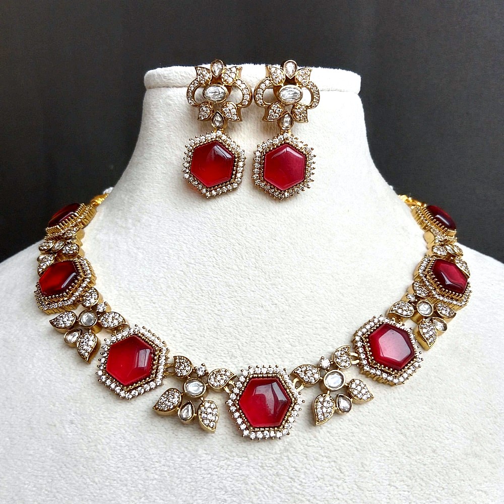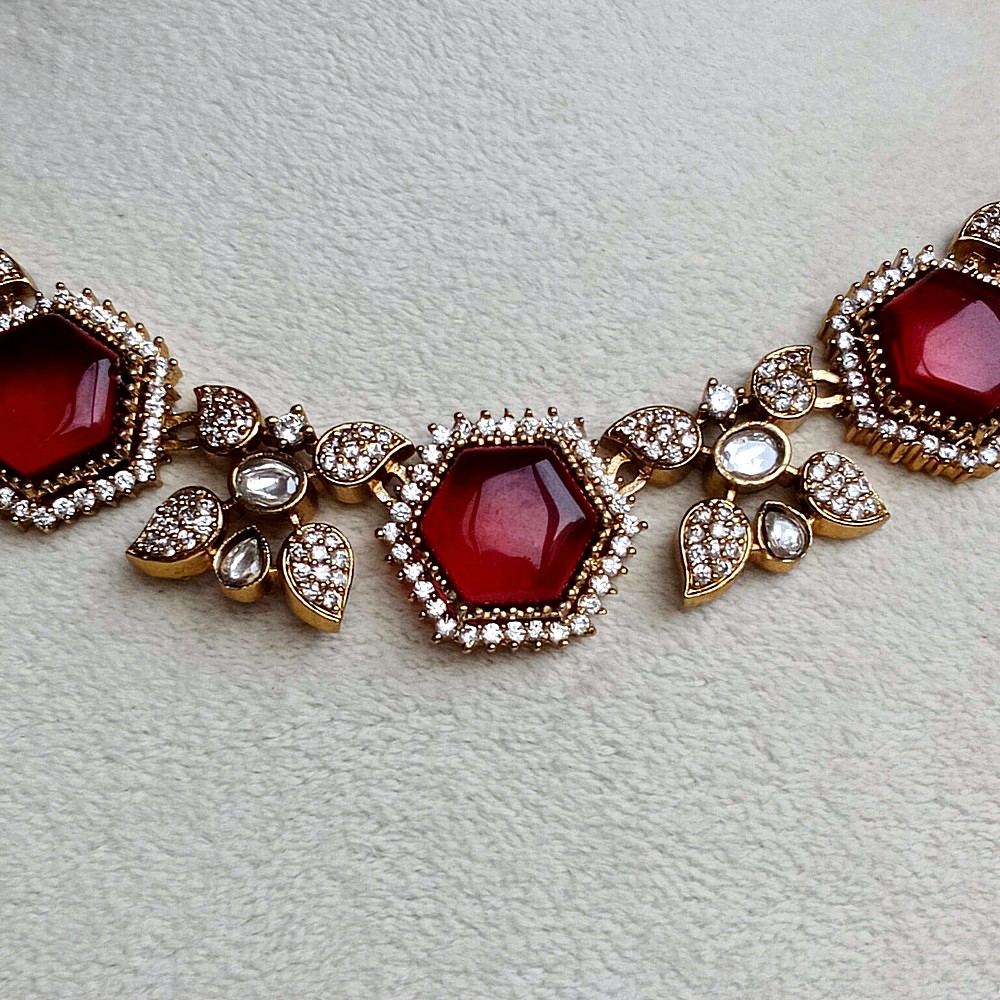 Designed to echo the quiet opulence of traditional bridal jewellery, this Red Stone Bridal Necklace Set with Earrings brings classic elegance into a refined silver-toned finish. Crafted from brass and adorned with deep red stone accents, the set balances richness with restraint. Each element is carefully assembled by hand, allowing the detailing to feel intimate rather than ornamental. With its perfectly proportioned 17.72-inch necklace length, the set frames the neckline beautifully without overwhelming the bridal look.