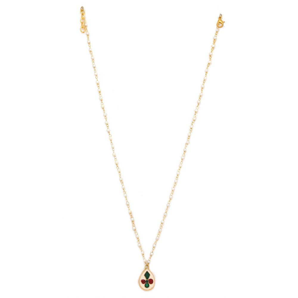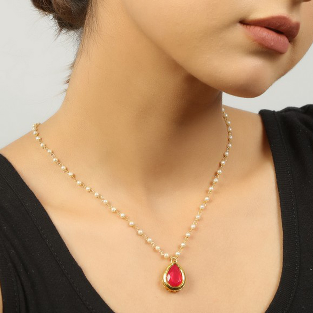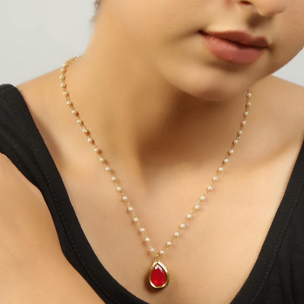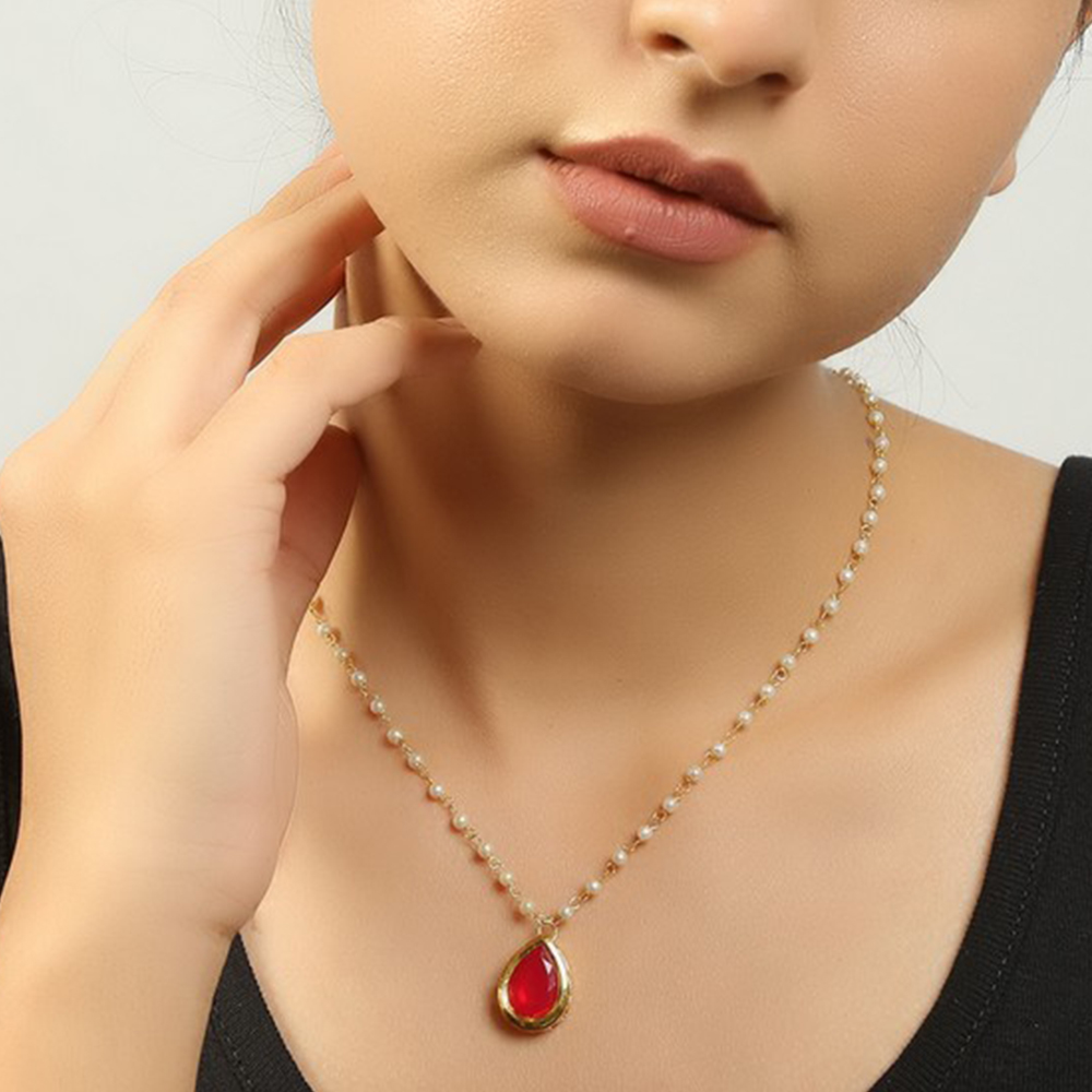 Celebrate individuality with this elegant Red Tear Drop Pendant Necklace with Pearl Chain. Featuring a vibrant red teardrop-shaped stone set in a gold-tone bezel and a delicate chain adorned with small pearls, this eye-catching necklace is perfect for bridal ensembles, festive occasions, and meaningful gifting. Packed & quality-checked by Indianshelf.