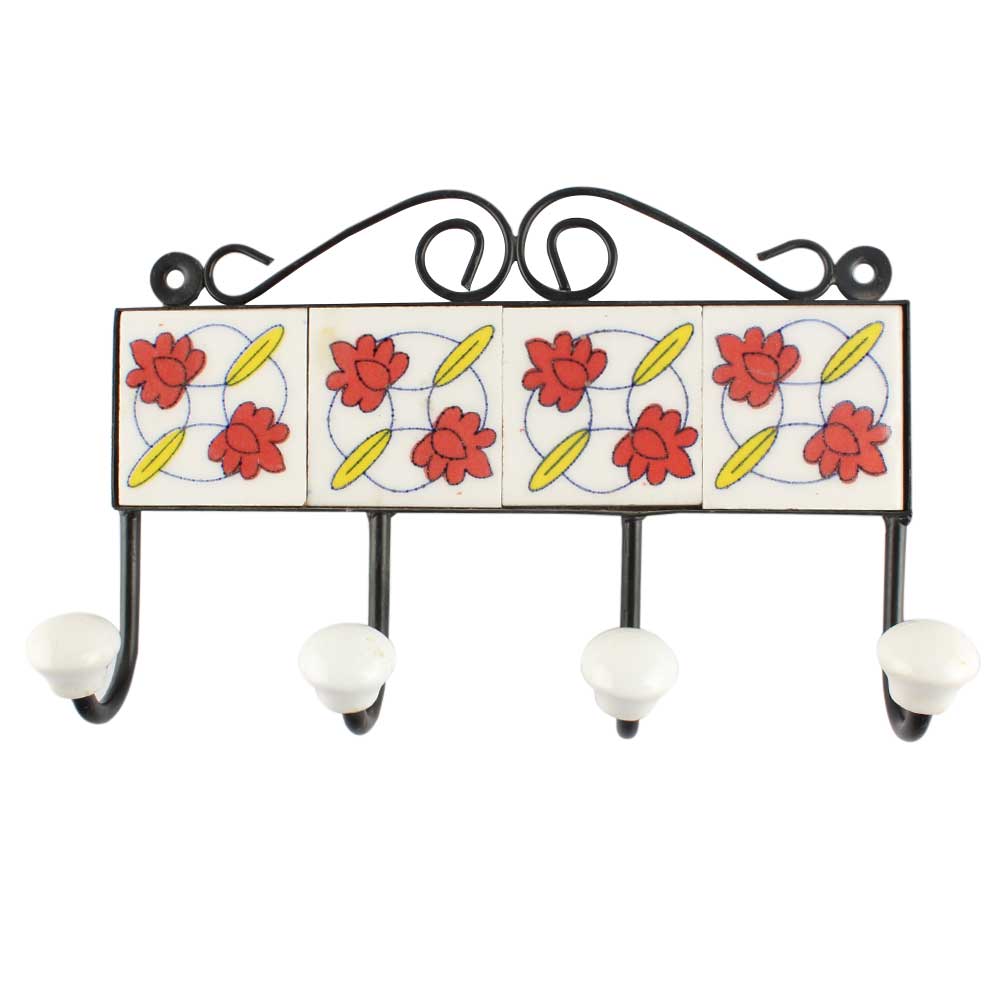 Red Tiny Flower Ceramic Tile Hook Online. When Put on Wall or Cabinet It is An Art in Itself. The Metal Part of this Hook is Black Powder Coated.