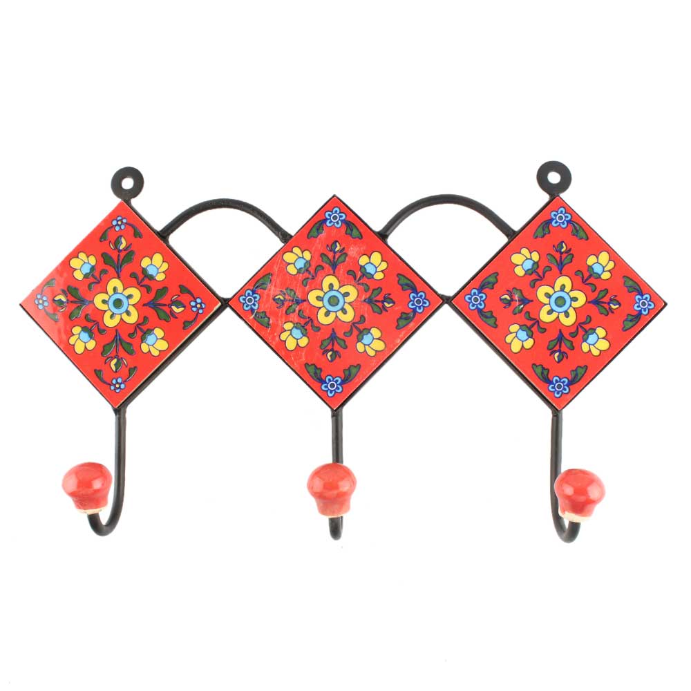 Red Tiny Flower Ceramic Tile Wall Hook. When Put on Wall or Cabinet It is An Art in Itself. The Metal Part of this Hook is Black Powder Coated.