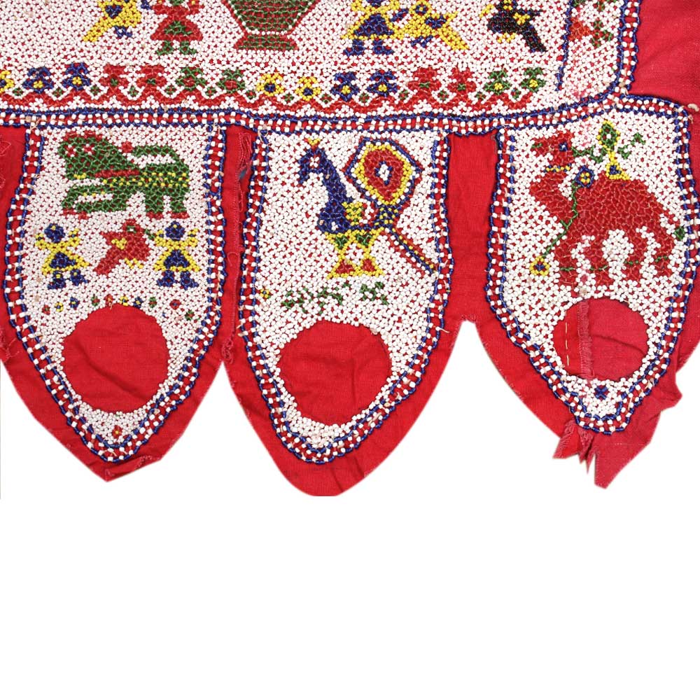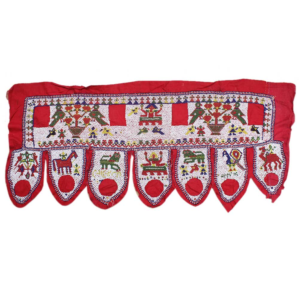 Toran door hanging was not only to decorate the home's entrance on special occasions, but also to welcome visitors and protect the house and household. The peacock at the very top of the pair of hangings above is a frequent design feature as a statement of welcome to guests, while embroidered gods and goddesses would also offer protection. Other prevalent elements included royal lions, cows and bulls, dancing maidens, and a variety of other endearing pictures.