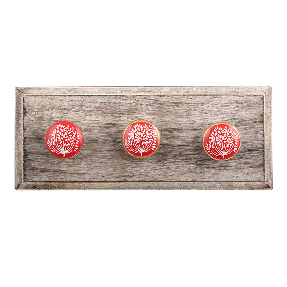 Red Waxflower Flat Ceramic Wooden Hook. A Perfect Complement to the Soft Tone of the Wood are these White Traditional Hat & Coat Hook Made of Genuine Porcelain and Brass. It can be use to Hang Jewellery, Leashes, Towels, Scarves, Light Weight Sweaters, Caps Etc.