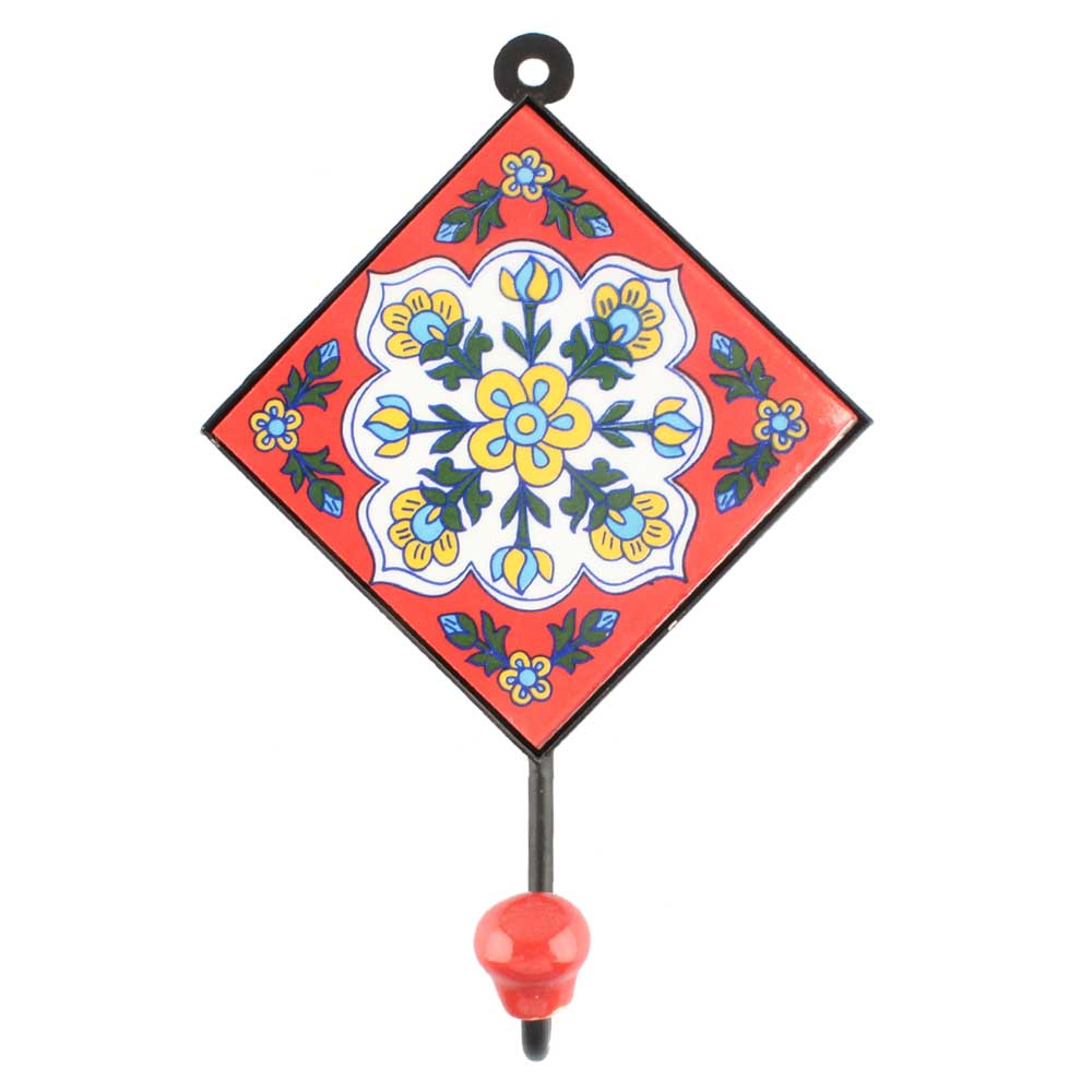 Red With White Floral Ceramic Tile Hook. When Put on Wall or Cabinet It is An Art in Itself. The Metal Part of this Hook is Black Powder Coated.