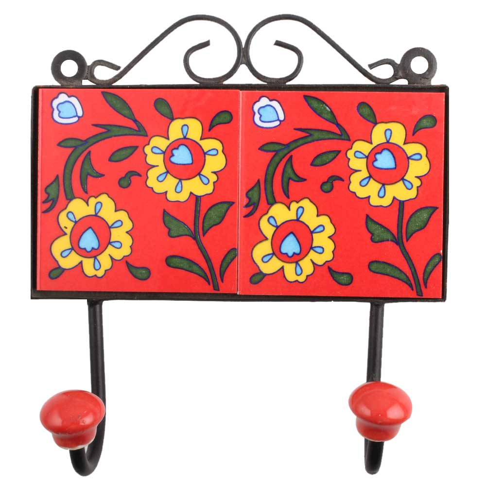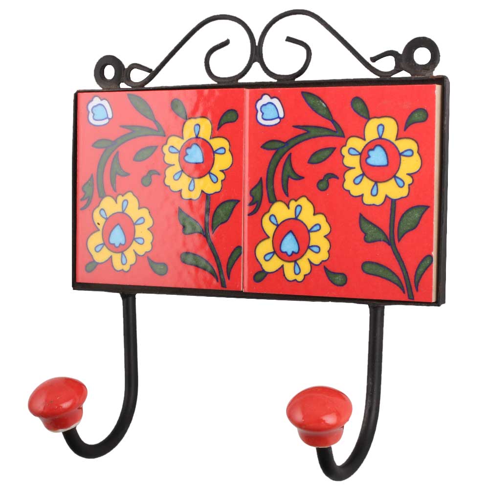 Red Yellow Floral Tiles Hook. When Put on Wall or Cabinet It is An Art in Itself. the Metal Part of This Hook is Black Powder Coated.