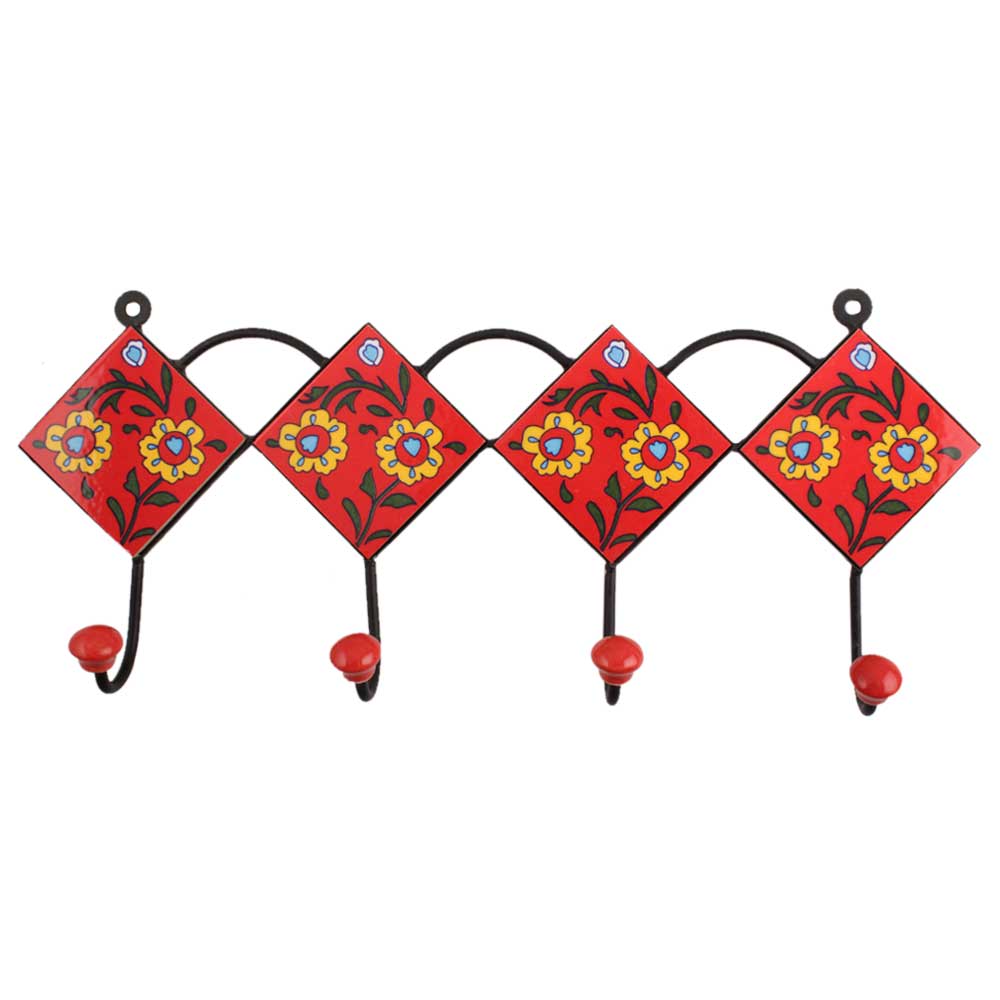 Red Yellow Floral Tiles Hook. When Put on Wall or Cabinet It is An Art in Itself. the Metal Part of This Hook is Black Powder Coated.