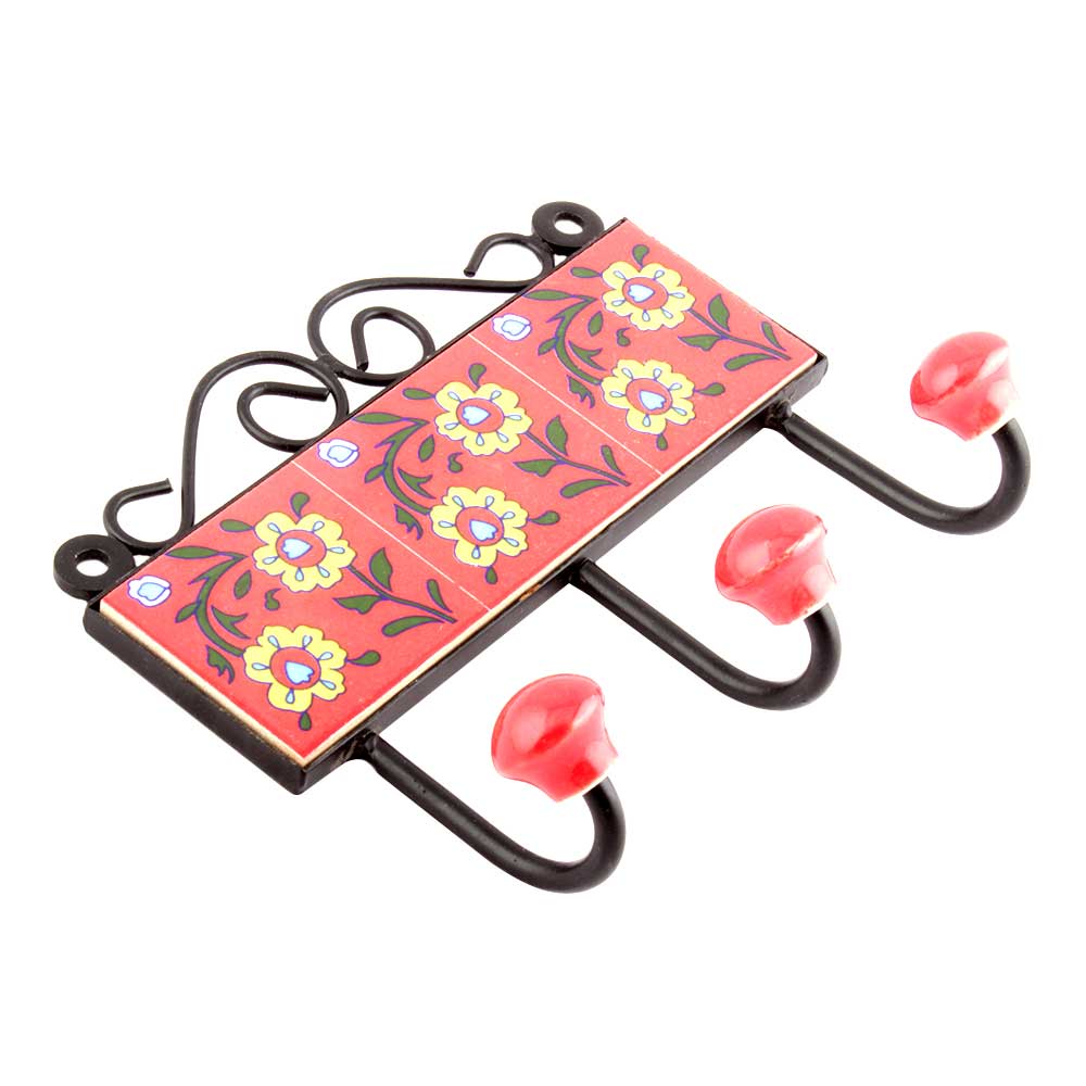 Red Yellow Flower Tiles Hooks. When Put on Wall or Cabinet it is an Art in itself. The Metal Part of this Hook is Black Powder Coated.