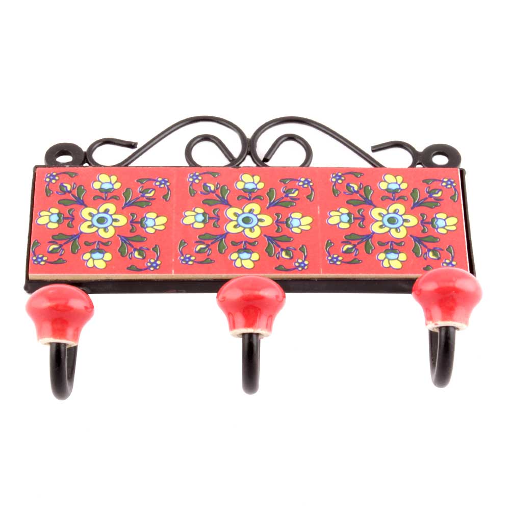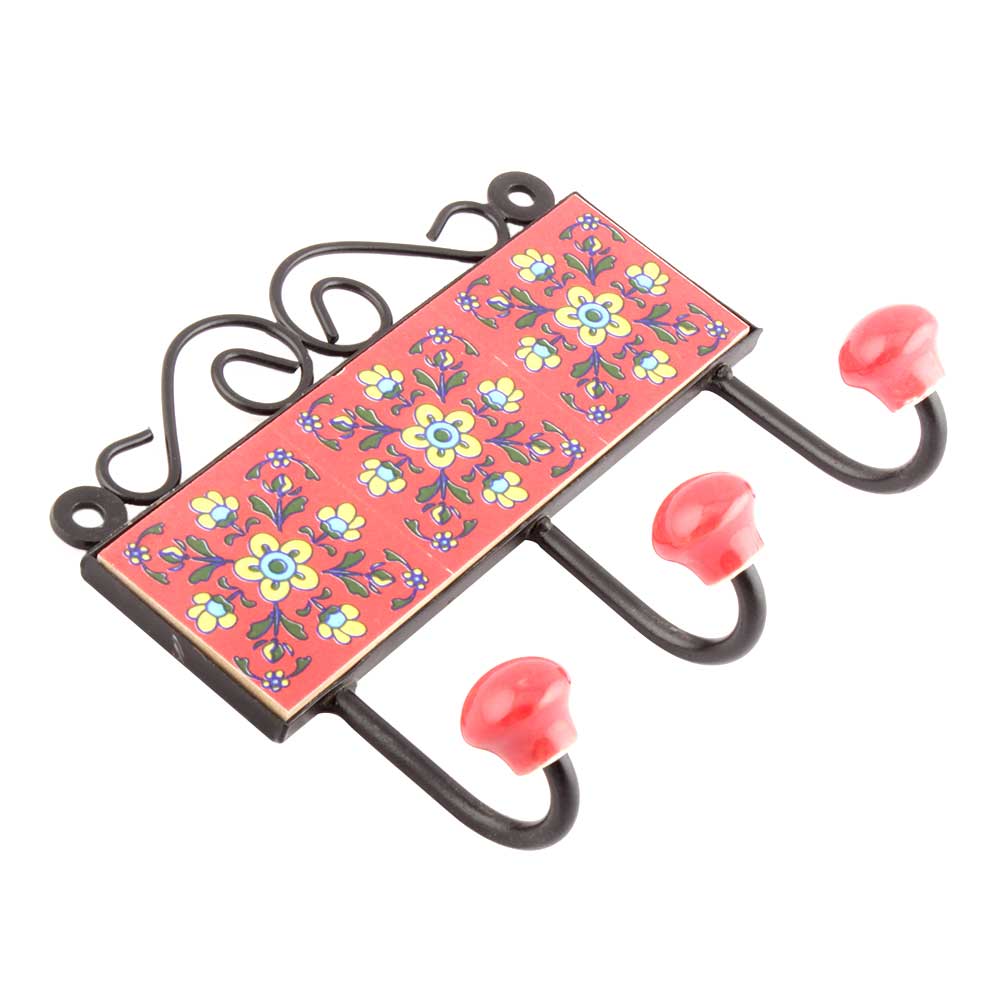 Red Yellow Tiny Flower Tiles Hooks. When Put on Wall or Cabinet it is an Art in itself. The Metal Part of this Hook is Black Powder Coated.