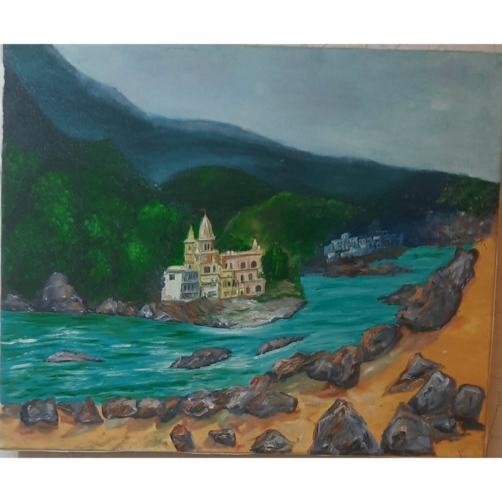Capture the spiritual serenity of the Himalayas with Riverside Temple in the Himalayas, a soulful Acrylic on Canvas painting by Artist Gayatri Sharma. Measuring 22 x 21 inches, this original artwork portrays a peaceful riverside temple set against the backdrop of lush green hills, rugged stone paths, and gently flowing turquoise waters. The harmonious blend of architecture and nature, with misty mountain layers and sacred waters, evokes the calming energy of Uttarakhand or Rishikesh landscapes. The intricate detailing of temple structures and rocky banks reflects the artist’s deep observation and reverence for India's sacred geography. Ideal for spiritual spaces, tranquil corners, or as a meditative centerpiece, this hand-painted scene offers peace, reflection, and visual depth.