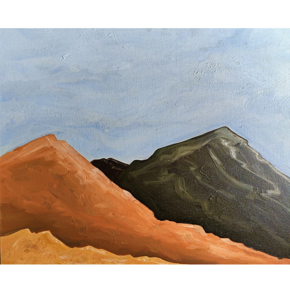 Romantic Landscape – Desert Slopes is a compact yet evocative oil painting by artist B. Manikanta, measuring 0.5 x 1.5 feet. With minimal strokes and bold color planes, the composition captures two contrasting mountain ridges—one steeped in warm terracotta hues and the other in deep earthy greens—rising beneath a softly textured sky. Despite its small scale, the painting delivers a grand sense of depth and temperature, evoking the stark beauty of desert terrain meeting distant hills. Manikanta’s brushwork reveals both silence and movement, inviting the viewer to experience the romance of untouched landscapes in a focused, intimate frame. Ideal for collectors drawn to nature’s geometry, minimalism, and color-driven storytelling.