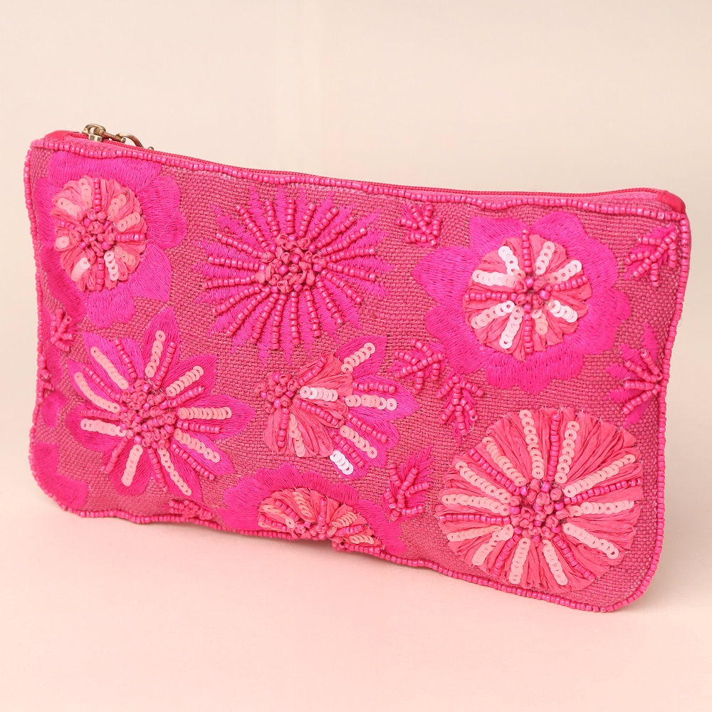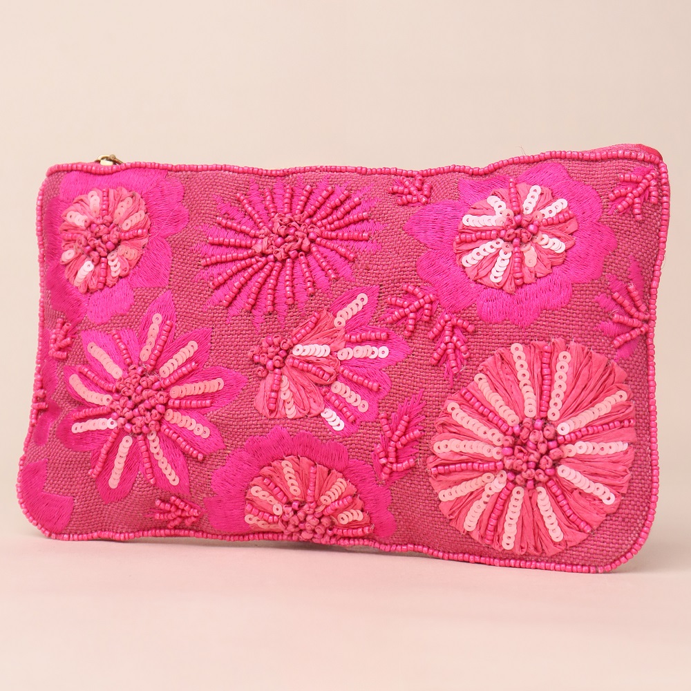 Celebrate bold femininity with this handcrafted pouch embellished in shimmering sequins and intricate threadwork. Featuring radiant floral patterns across its canvas, this pouch is a stunning blend of artistry and utility. A stylish choice for carrying essentials, it adds a vibrant statement to both traditional and modern ensembles.