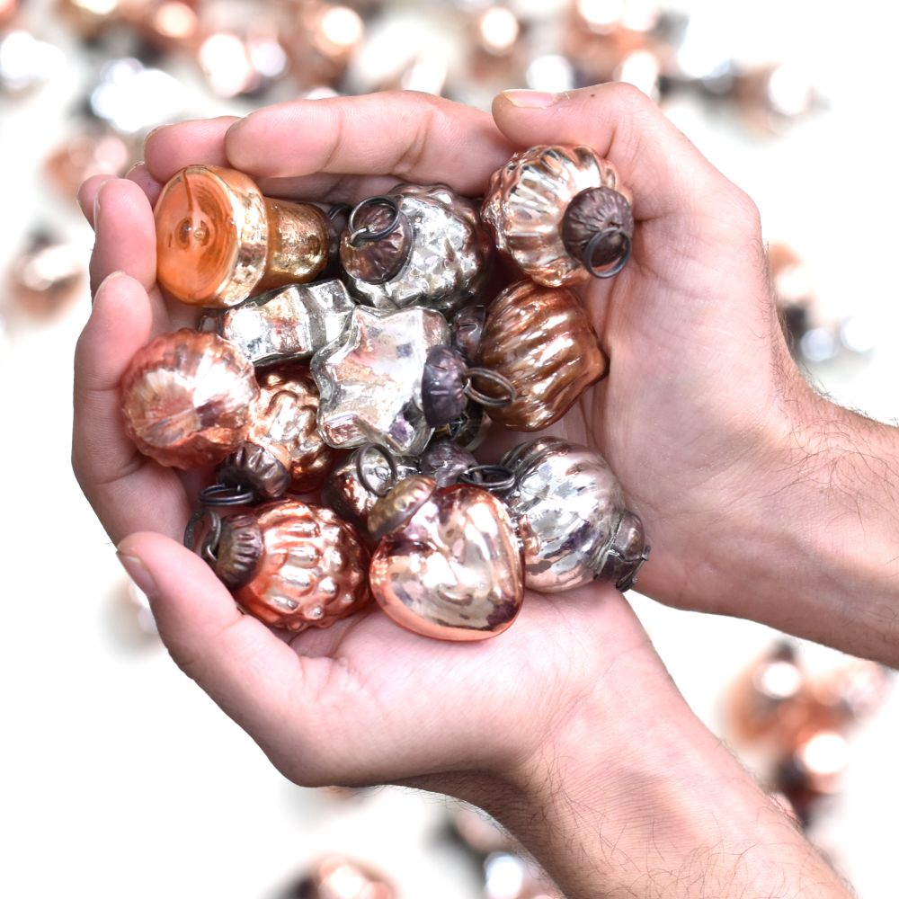 This Glass Christmas ornaments is beautifully crafted in the enchanting hues of Rose gold and Silver. Each piece is meticulously handcrafted by skilled Indian artisans, ensuring a unique and artisanal touch to your festivities. This ornament set offers an array of charming shapes and designs, adding a touch of elegance and sophistication to your Christmas tree or any festive setting. The delicate blend of Rose gold and Silver adds a touch of opulence to your home, office, hotel, or shop decorations. These ornaments are not limited to Christmas alone, they are versatile enough to adorn your space during various festivals and celebrations. Their timeless appeal makes them a perfect addition to housewarming parties, weddings, or other special occasions. With their fine craftsmanship and attention to detail, these ornaments make for a thoughtful and cherished gift for your loved ones. Share the joy of the season by gifting them these exquisite decorations that capture the essence of Indian artistry and the spirit of celebration.