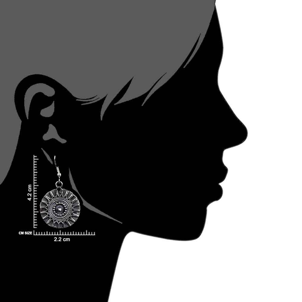Handmade Oxidized 92.5 Sterling silver Dangle Earrings in round shaped engraved wheel design makes it the ideal choice to be worn on weddings, reception, engagement, ladies sangeet, birthday , picnic or other social functions. Gift it to your near and dear ones on Diwali, Birthdays or valentine.