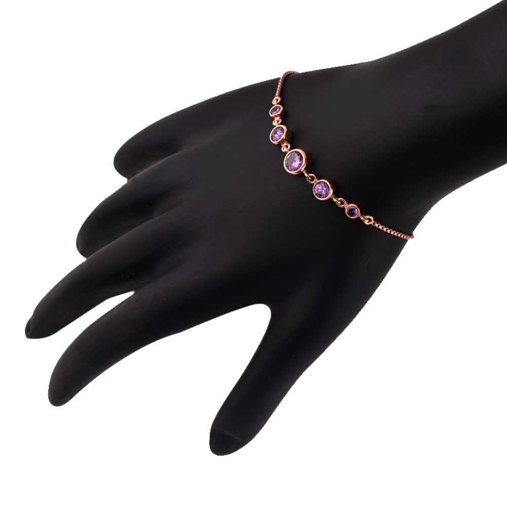 Elegant and romantic 92.5 Sterling Silver Bracelet decorated with round amethyst stones is the perfect accessory for that special evening, valentine day, anniversary, birthday or a small family get together. It comes with rose gold polish.