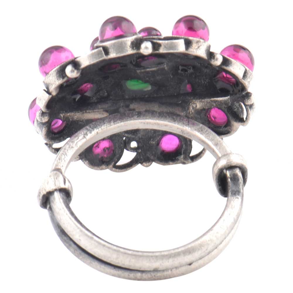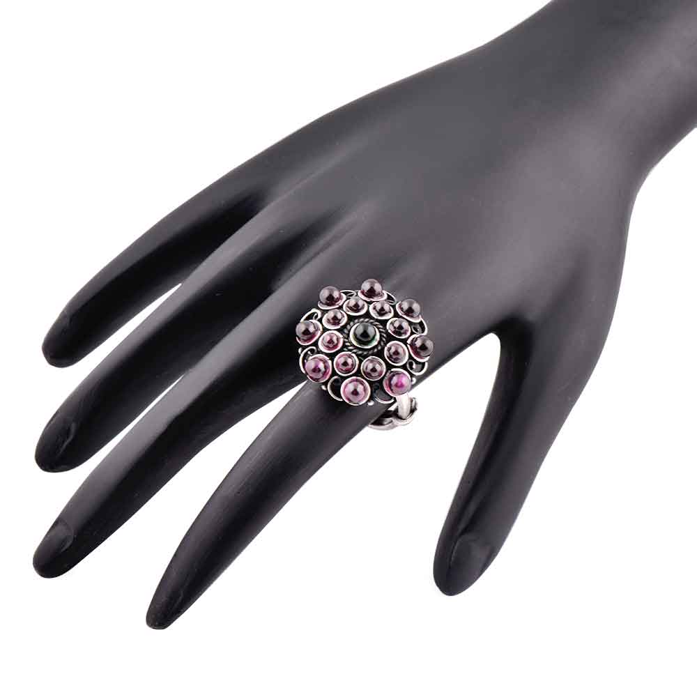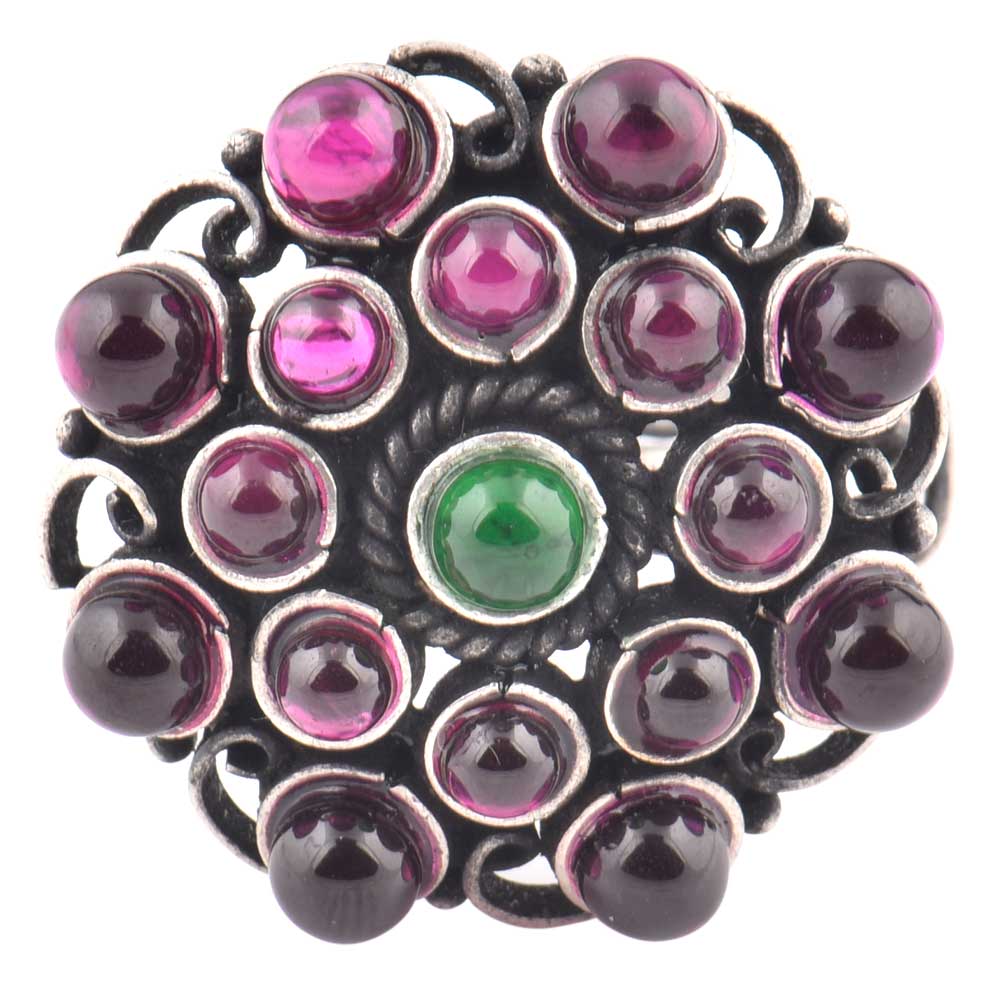 Many amethyst stones studded 92.5 Sterling Silver Ring with a round green onyx stone adds a touch of class and elegance to ordinary dress or outfit such as lehengas, suits, suits , dress or gowns.