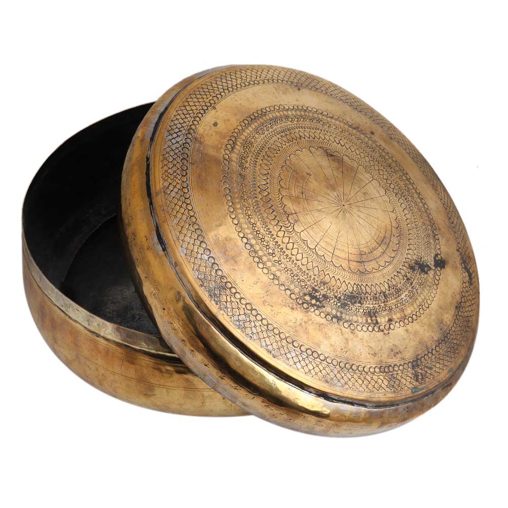 Round Brass Box Engraved Design with removable lid with engraved design made by the expert craftsmen sing traditional methods. Jewelry and trinkets box, Kitchen Essential, Collectible, Table Decor, Chapatti Box.