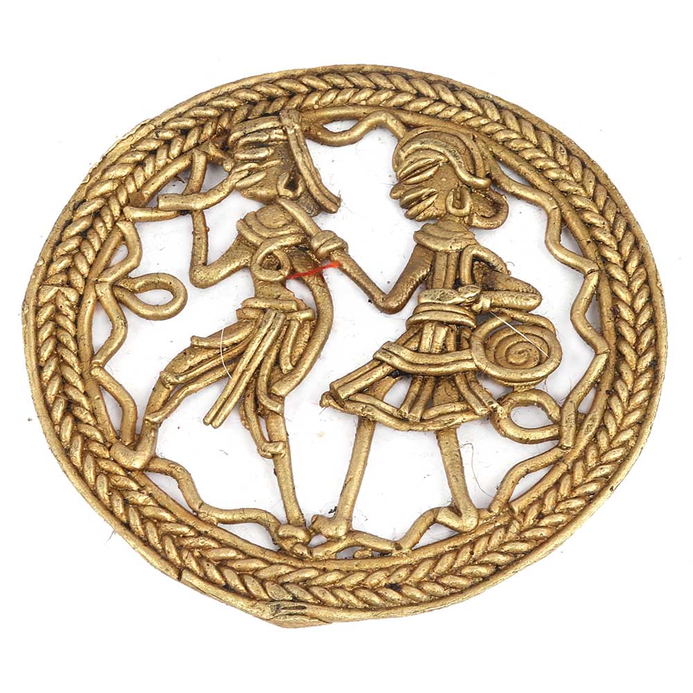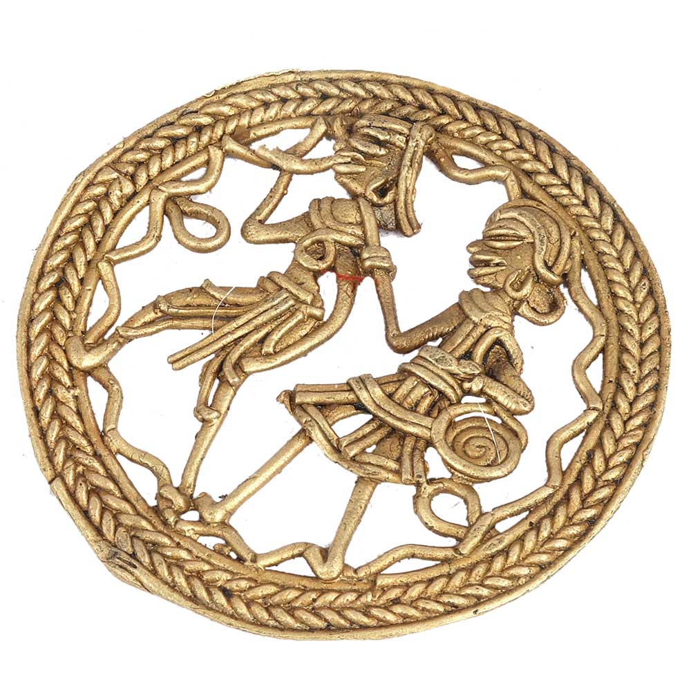 Round Brass Rural Dhokra Artwork Wall Hanging where the lady is holding her husband's hand .Weddings , anniversary, house warming, office and hotel decoration, souvenir, gift for your near and dear ones on Diwali, Christmas and other new year.