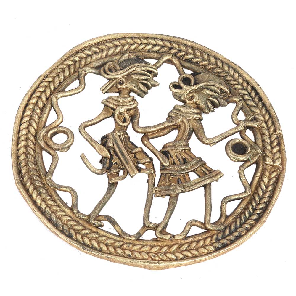 Round Brass Wall Hanging of Village Couple Daily Activity with intricate lattice ornamentation and intricate design with a round frame. framed or simply mounted on the wall or just placed on the table against the wall. Wedding gift, anniversary gift, house warming gift for your friends and family.