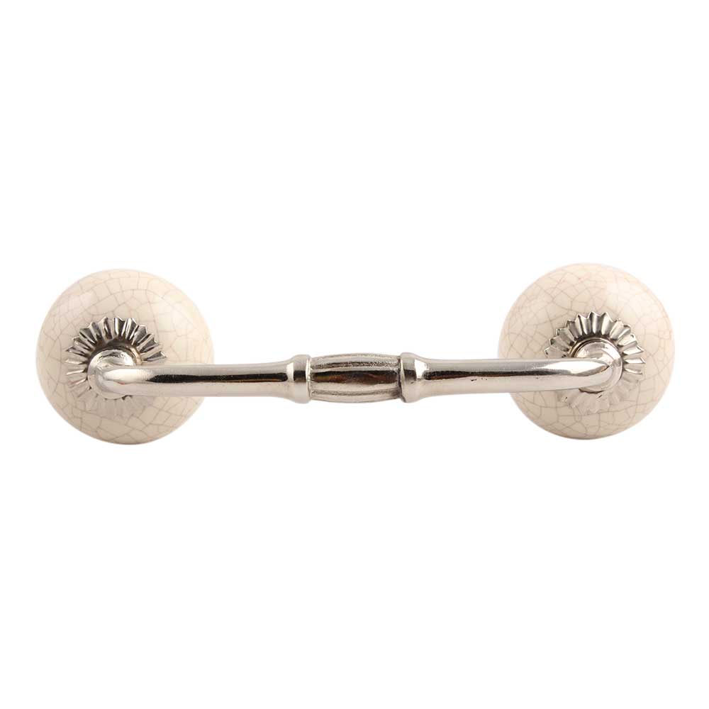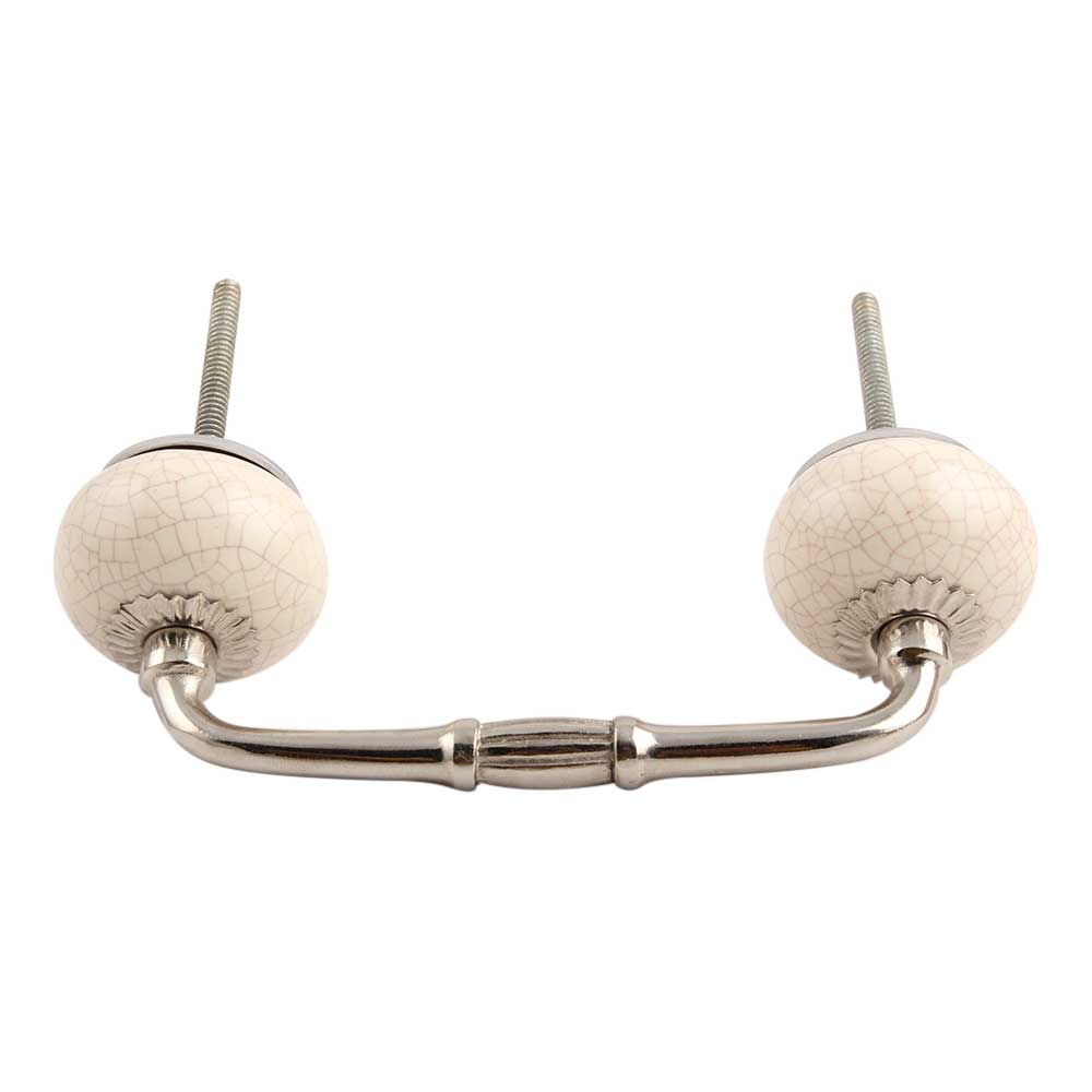 This round crackle ceramic bridge handle showcases a unique, textured surface with a charming crackle finish. Its understated yet sophisticated design makes it a perfect addition to any furniture piece, blending style with functionality.