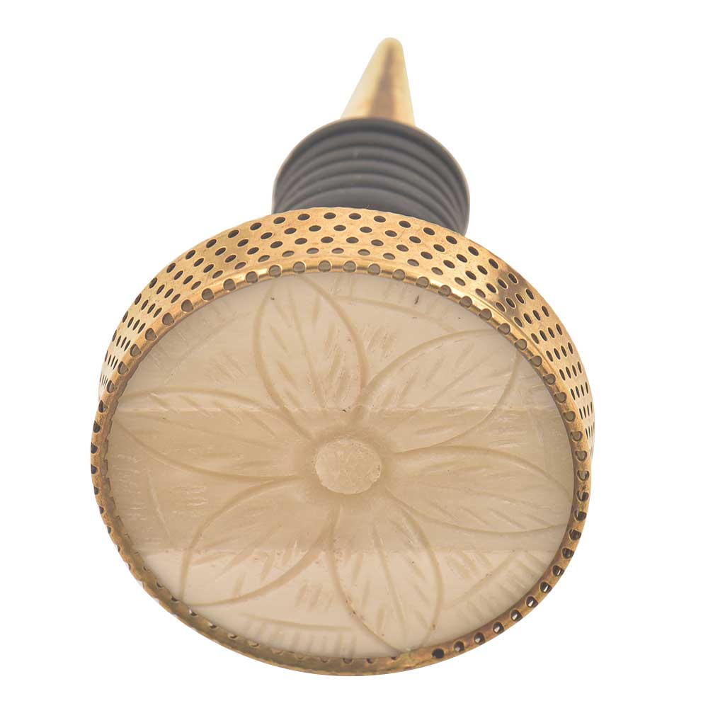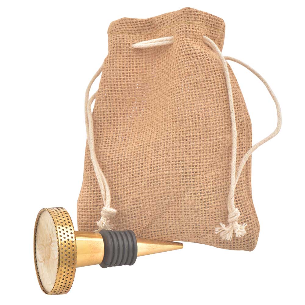 Round Cream Flower Metal And Bone Wine Stopper. Zinc Alloy Wine Bottle Stopper with Attractive Jute Bag Packaging.