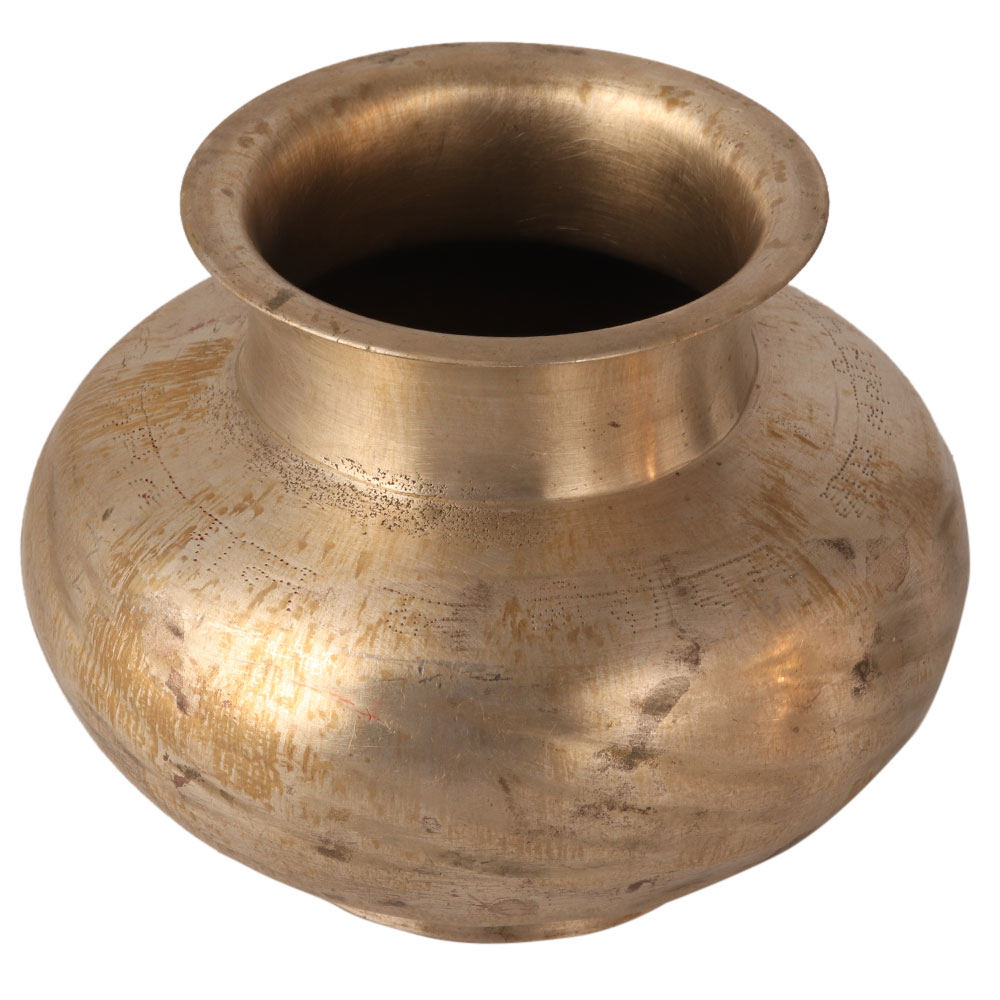 This heavy holy water pot is carved from a white metal alloy. It has a round shape and is vintage style. It has been embossed with line patterns. It has a long neck with a small mouth and a large belly. It is used in Hindu rituals like Kua Pujan (to celebrate the newborn child). Display it in your vintage collection.